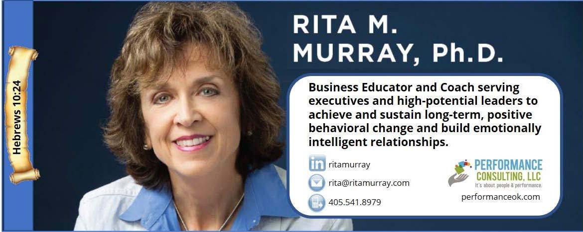 Rita Murray, PhD, is the Founder and Principal of Performance Consulting, LLC, an organizational development firm, previous CEO and Chairman of a national energy services company, cognitive psychologist, Certified Speaking Professional (CSP), executive coach, and sought-after leadership consultant. She has held leadership roles at GE and Lockheed, and is also a private pilot. Dr. Murray frequently speaks at leadership events and conferences and is highly regarded for her ability to connect personal and interpersonal development with the needs of business and with mobile and virtual technology. She has a particular gift for explaining the different perspectives of each generation and personality types to create a bridge of understanding towards healthier business relationships and ultimately, a stronger bottom line. Dr. Murray lives in Moore, OK with her husband, Ron. See more at performanceok.com