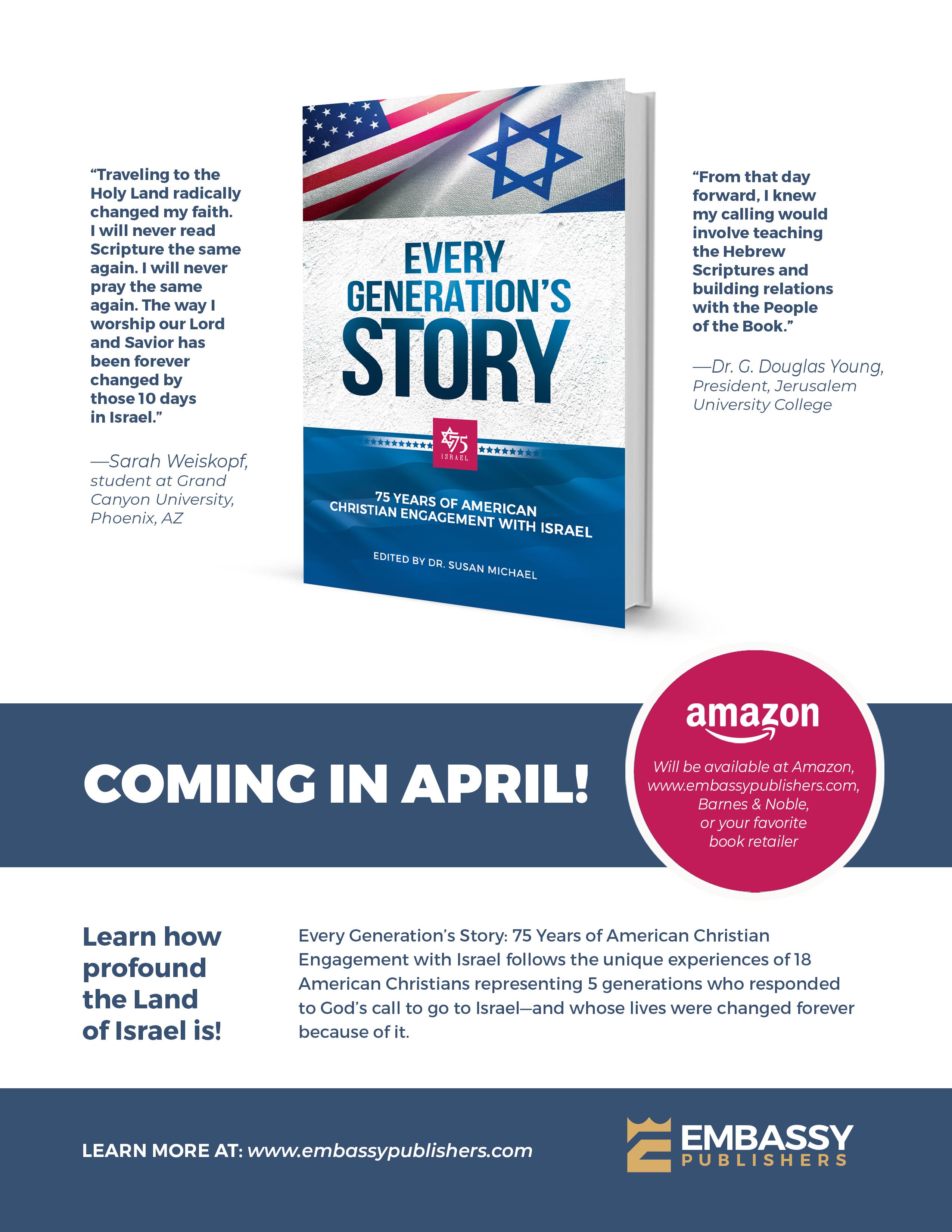 Every Generation’s Story: 75 Years of American Christian Engagement with Israel follows the unique experiences of 18 American Christians representing 5 generations who responded to God’s call to go to Israel–and whose lives were changed forever because of it.