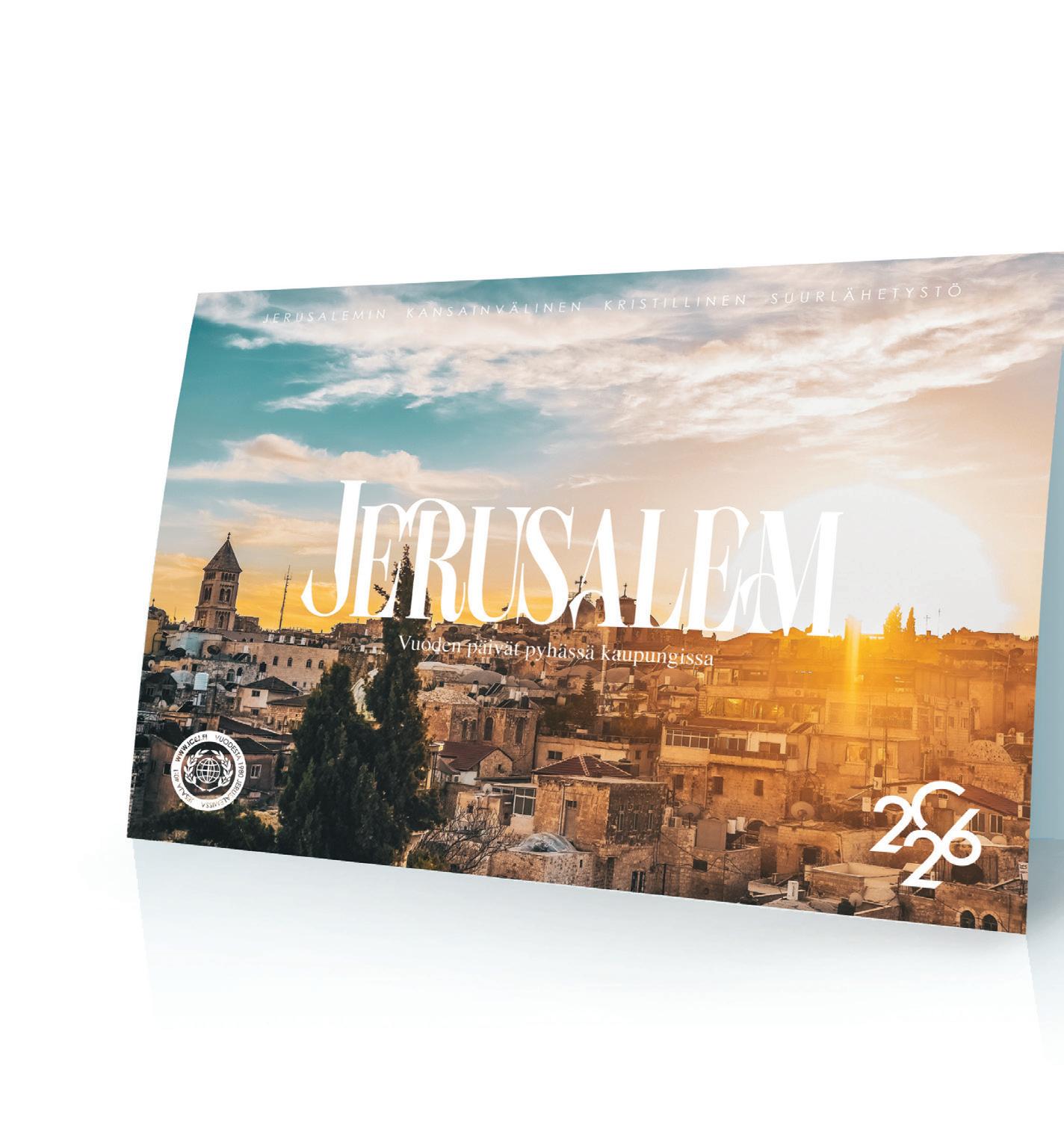 Innostava ja laadukas seinäkalenteri, joka kuljettaa sinut vuoden 2026 läpi Jerusalemin ikuisen kaupungin ainutlaatuisessa tunnelmassa. Jokainen kuukausi tarjoaa kauniin näkymän ja inspiroivan tekstin, jossa historia, nykypäivä ja Raamattu kietoutuvat yhteen.