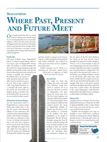 and have opened a museum in her honour. Visitors are taken through her fascinating life with various exhibitions and artifacts—as well as given the chance to have a prophecy given about them. Another museum can be found in a charming tiny old house, named Árnes, which gives an impression of daily life in the early 20th century. Art and Fish You might not think that modern day artists and small town fishermen would have much in common, but as it turns out, they have co-existed in Skagaströnd with great success for several years now. The Nes Artist Residency was opened in 2008 and has resulted in a colourful atmosphere where past and present traditions find common ground. The mayor of Skagaströnd, Magnús B. Jónsson, says the success of the artist residency is a testament to the positivity and openmindedness of the people of Skagaströnd. “We have all types of people coming here from all over the world and staying with us for extended periods of time working on their craft and the fact that it has gone seamlessly really says something about our community.” Magnús says
