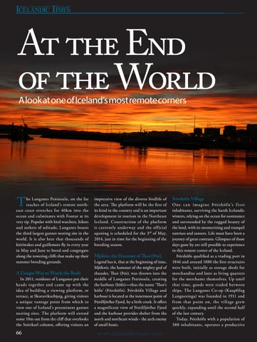 he Langanes Peninsula, on the far reaches of Iceland’s remote northeast coast stretches for 40km into the ocean and culminates with Fontur at its very tip. Popular with bird watchers, hikers and seekers of solitude, Langanes boasts the third largest gannet nesting site in the world. It is also here that thousands of kittiwakes and guillemots fly in every year in May and June to breed and congregate along the towering cliffs that make up their summer breeding grounds.