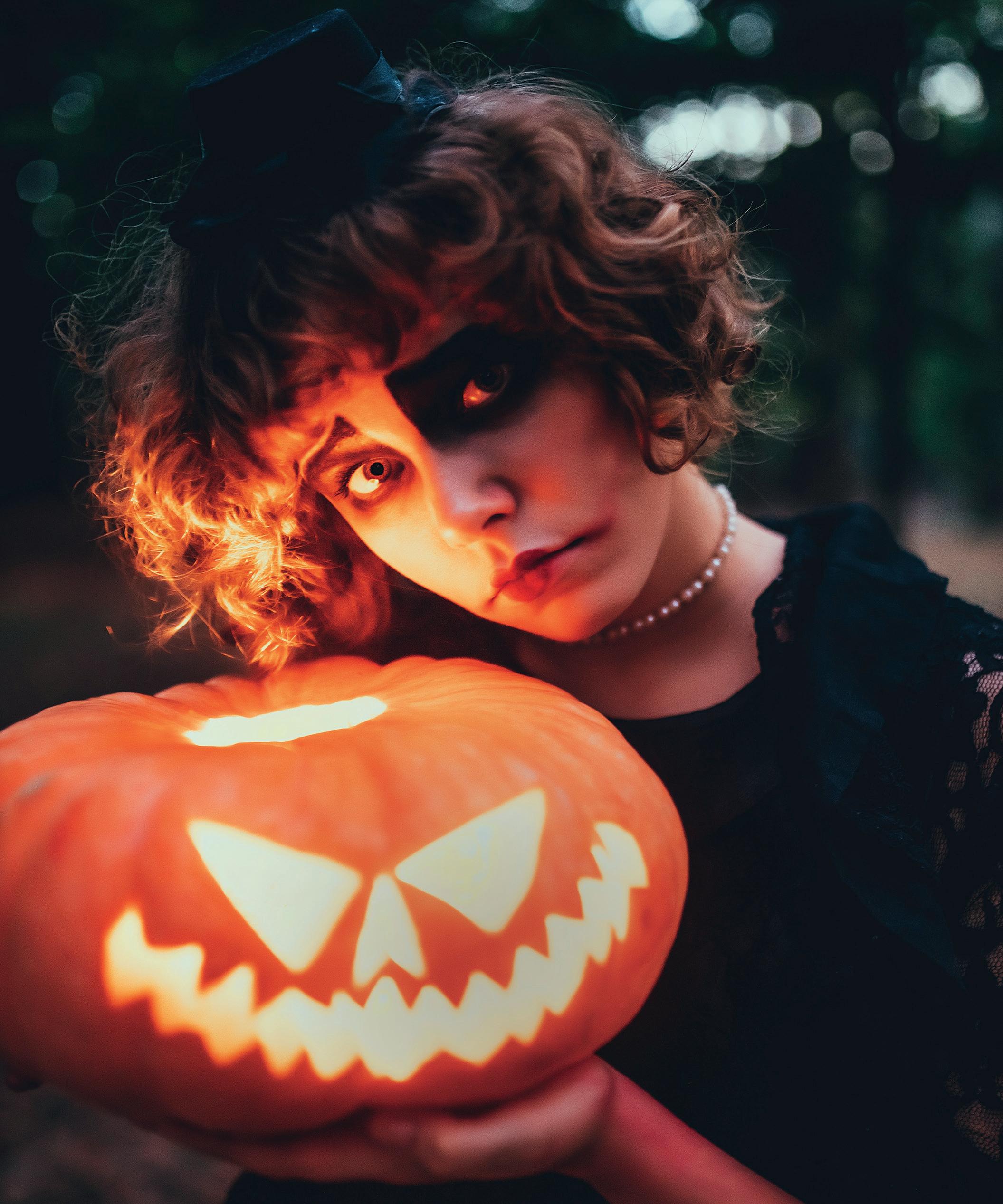 Get into the Halloween spirit by becoming a pumpkin. Wear all orange clothing and cut out a face from black construction paper. Attach the face to your outfit or use face paint. You can