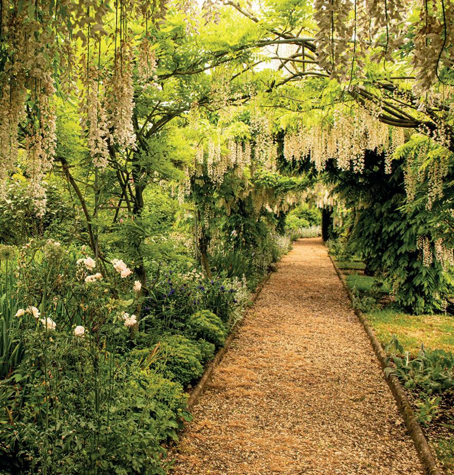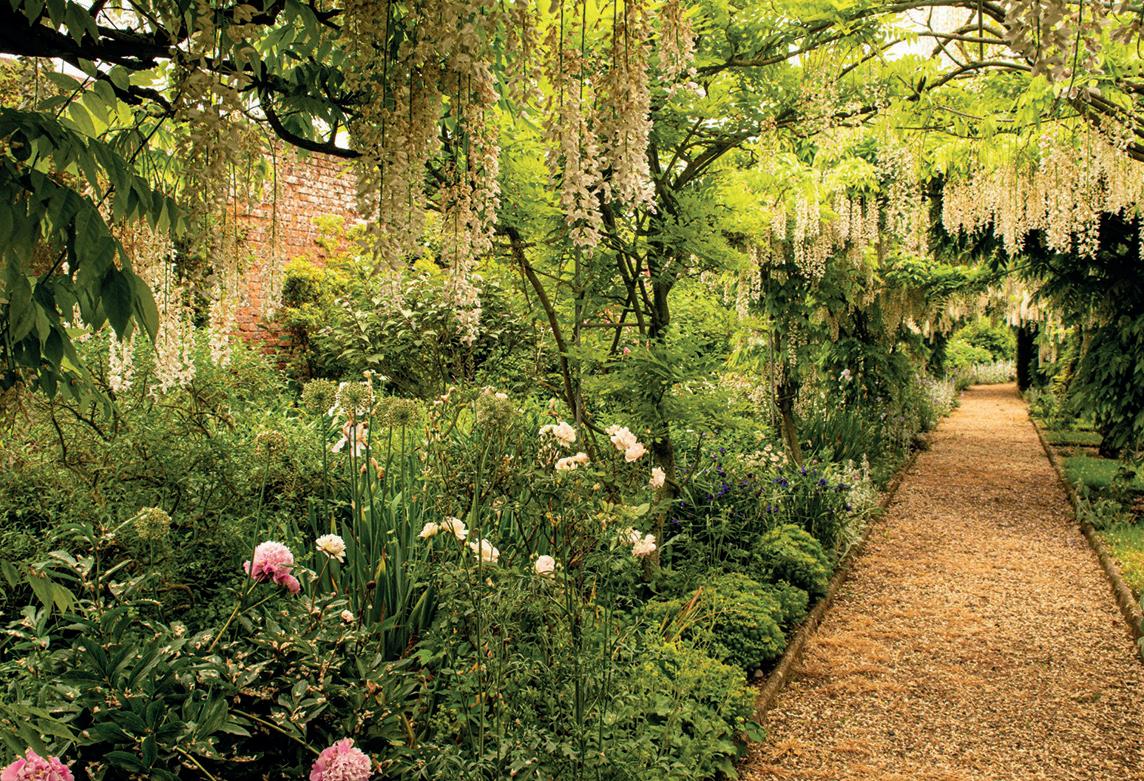Walled garden featuring a long, white wisteria walk. This is set in the grounds of a Georgian rectory surrounded by parkland.