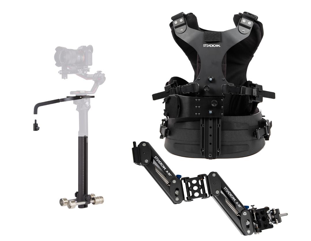 Steadimate-RS enhances the capabilities of DJI’s handheld motorized gimbal by refining the camera stabilization and improving operator comfort, creating a movement similar to a traditional Steadicam sled. It converts the handheld motorized gimbal into a full-body-worn stabilizer by attaching a new mechanical gimbal and pan bearing to the Ronin, along with a weighted gimbal post extension with a fine-tuned balance adjustment. Adding a stabilizer arm greatly reduces the bouncing image effect on the z-axis while walking with handheld gimbals, allowing for more natural-looking manual camera-pan movements. It also helps to reduce operator fatigue (and extend operating time) by helping translate system weight across the torso and through the spring arm and vest. Steadimate-RS comes in several kits. The RS features a gimbal, base and balance stud; RS-A15 adds the A15 arm and aero vest; and the RS-A30 features the A30 arm and zephyr vest.