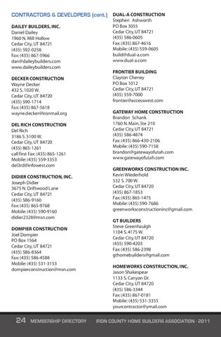 CONTRACTORS & DEVELOPERS (cont.) DUAL-A CONSTRUCTION DAILEY BUILDERS, INC. Daniel Dailey 1960 N. Mill Hollow Cedar City, UT 84721 (435) 592-0258 Fax: (435) 867-5966 dan@daileybuilders.com www.daileybuilders.com DECKER CONSTRUCTION Wayne Decker 432 S. 1020 W. Cedar City, UT 84720 (435) 590-1714 Fax: (435) 867-5618 wayne.decker@ironmail.org DEL RICH CONSTRUCTION Del Rich 3186 S. 5100 W. Cedar City, UT 84720 (435) 865-1261 call first Fax: (435) 865-1261 Mobile: (435) 559-3353 del3rd@infowest.com DIDIER CONSTRUCTION, INC. Joseph Didier 3675 N. Driftwood Lane Cedar City, UT 84721 (435) 586-9160 Fax: (435) 865-9768 Mobile: (435) 590-9160 didier2328@msn.com DOMPIER CONSTRUCTION Joel Dompier PO Box 1564 Cedar City, UT 84721 (435) 586-8364 Fax: (435) 586-4588 Mobile: (435) 531-3153 dompierconstruction@msn.com