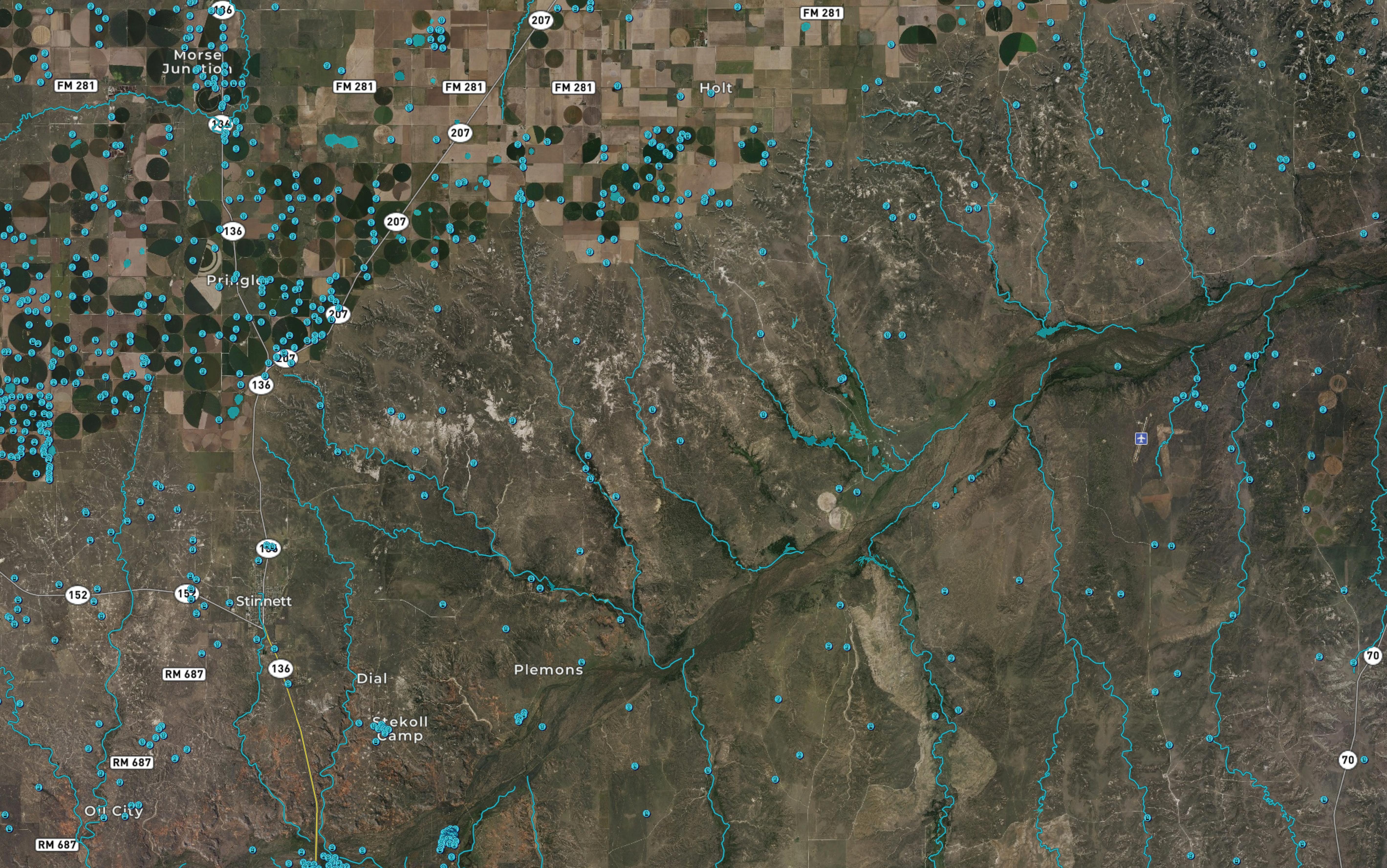 There are 5 - Ogallala aquifer wells which provide water for irrigation pivots. There are 830 acres that are covered by irrigation.