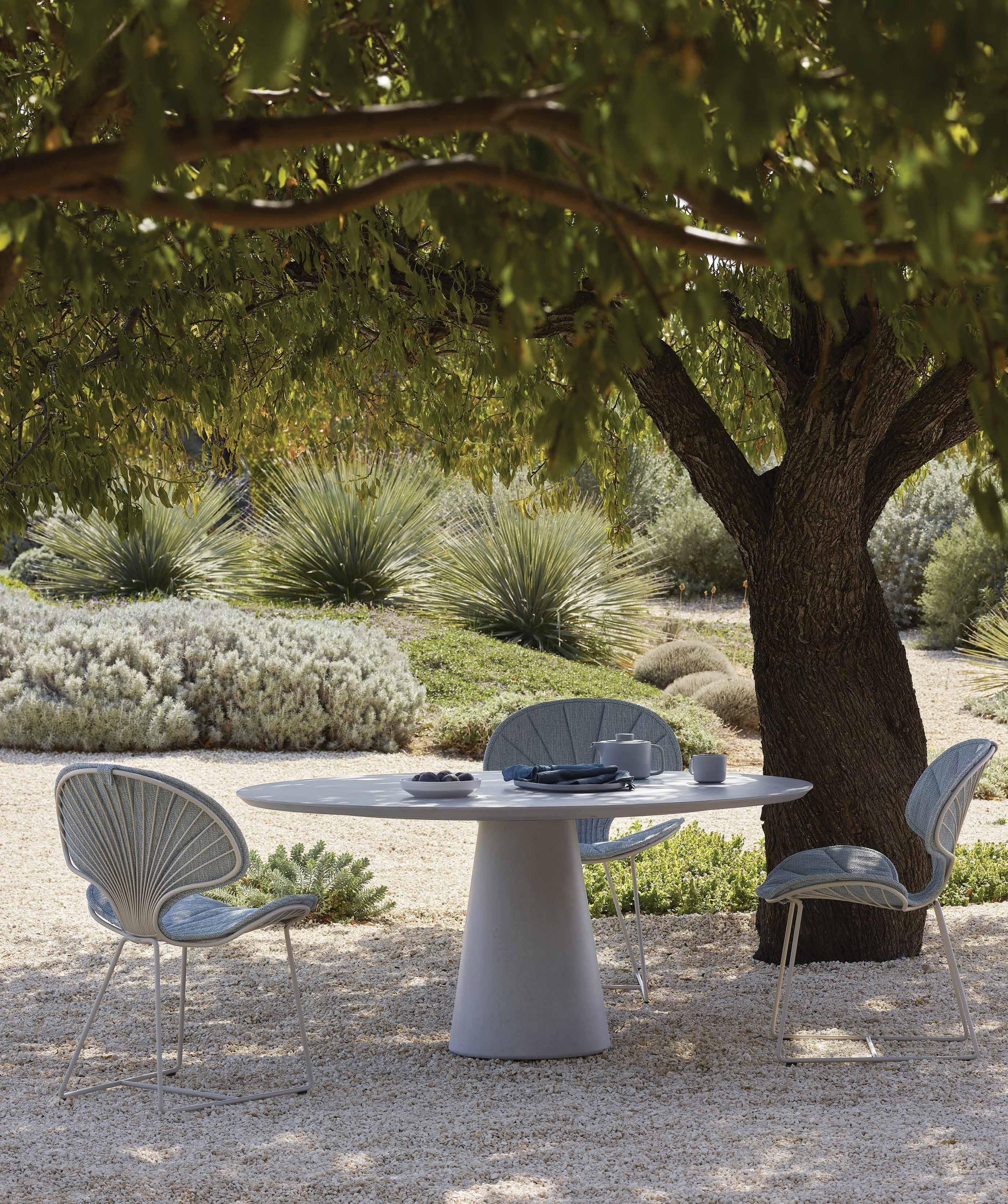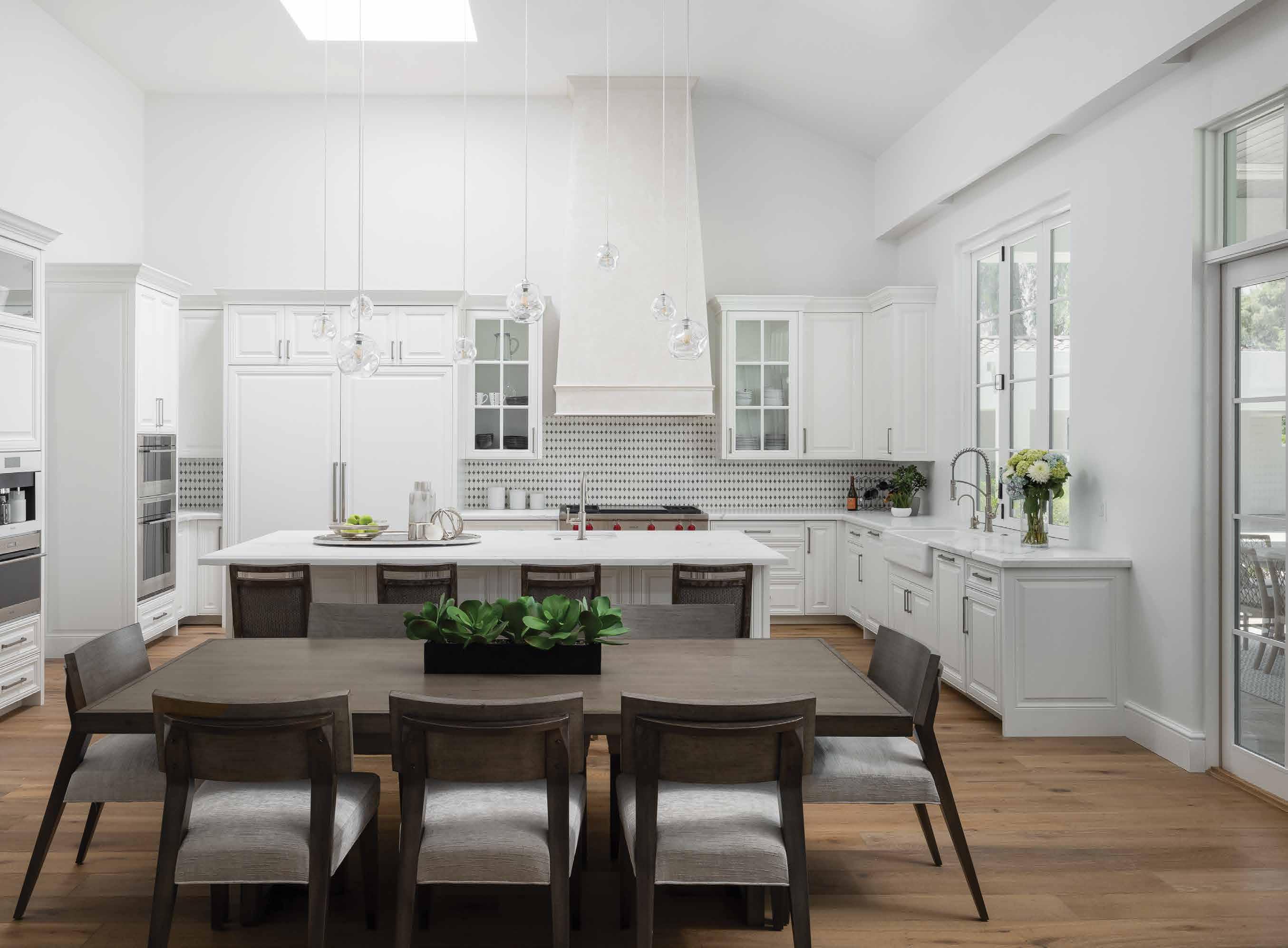 In the dining room, a coved ceiling provides a luminous lid for the long wooden table and curvaceous chairs. The client fell in love with richly patterned Klondike quartz in a slab warehouse, which Shively installed as a dramatic, natural art piece to surround the fireplace in the family room. The final ambiance is chic and serene, not clinical and sterile.