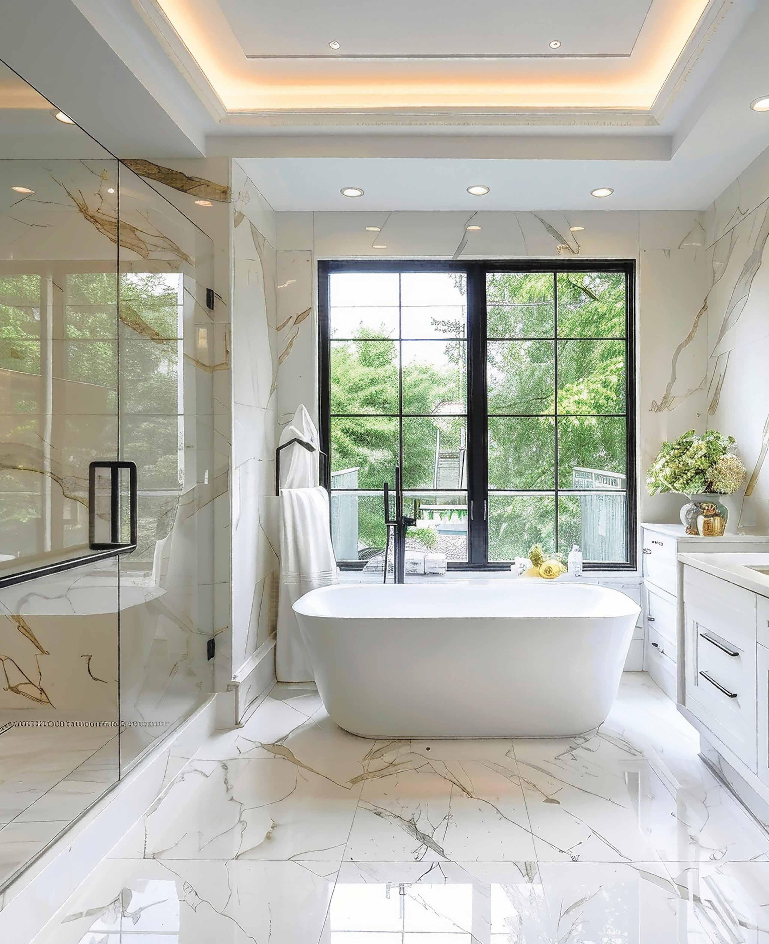 The primary bathroom involved designing a new ADA-compliant floor plan with abundant lighting, improved functionality, and accessibility while selecting appropriate finishes and ADA fixtures. Some of the standout design aesthetic elements include a custom 10-foot-high solid walnut, modern barn-style entry door, textured white wood-patterned tile plank flooring, a unique custom translucent blue window treatment, organic patterned wallpaper, 3-D wall tile, and custom cabinetry.
