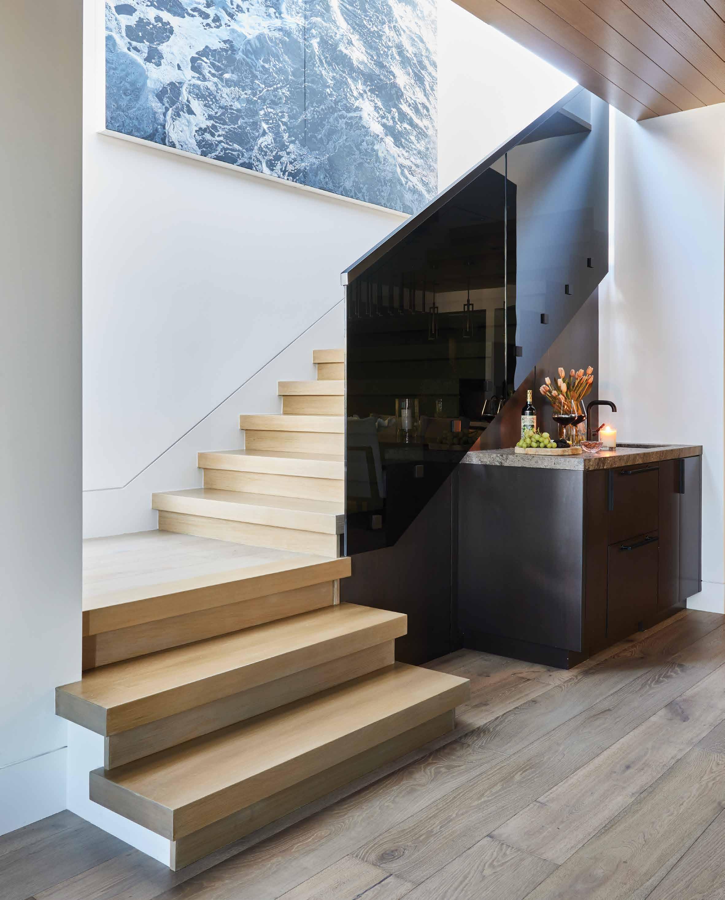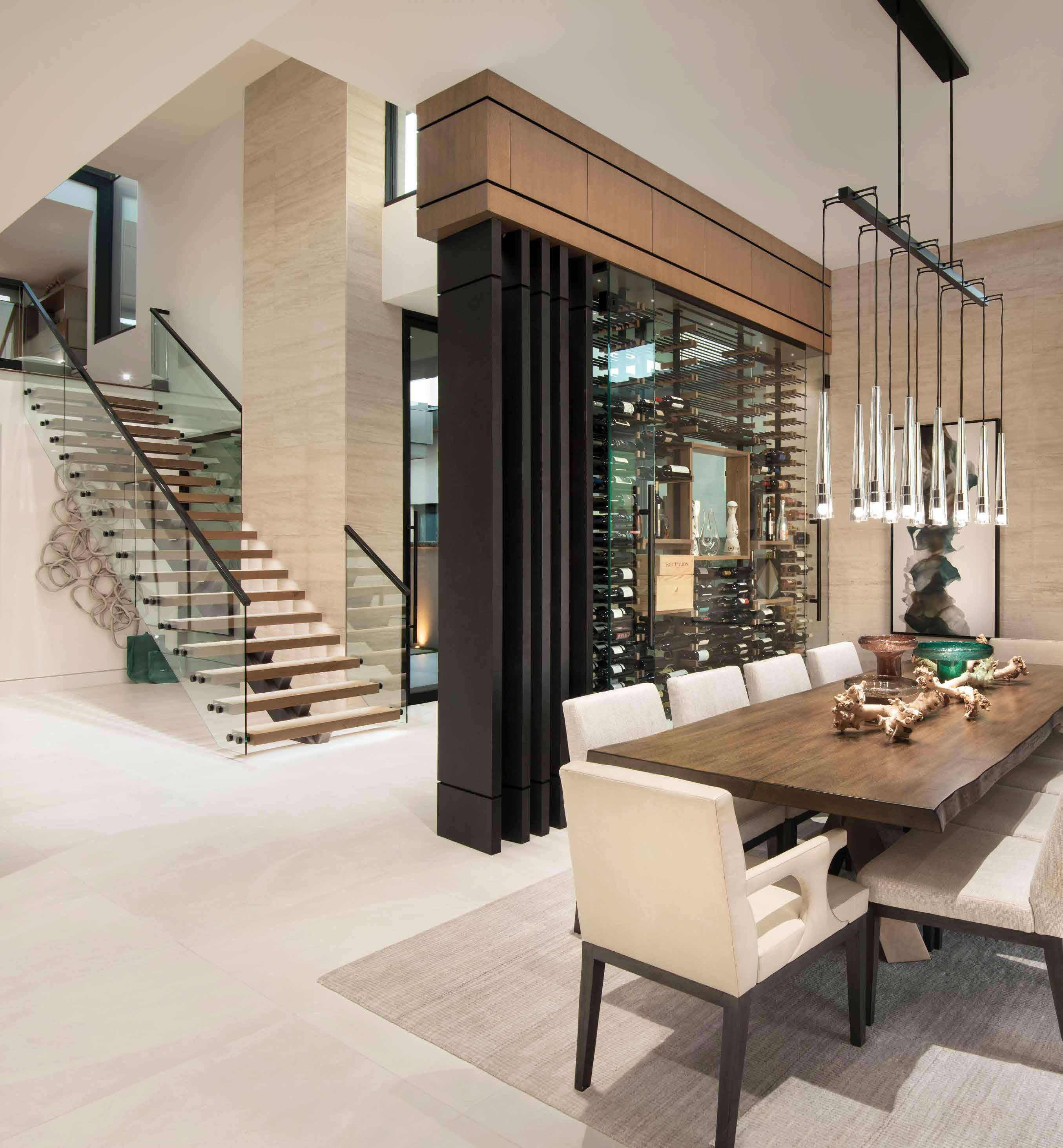 The interior is further marked by several architectural details, including a cantilevered, glass-rail staircase that leads to the second level and a steel, glass and wood wine display cabinet of Green’s design, which separates the entry from the dining room. “The wine display is meant to be a signature entry piece without taking away from the views,” Green explains. “When it’s lit up at night, it glows.”