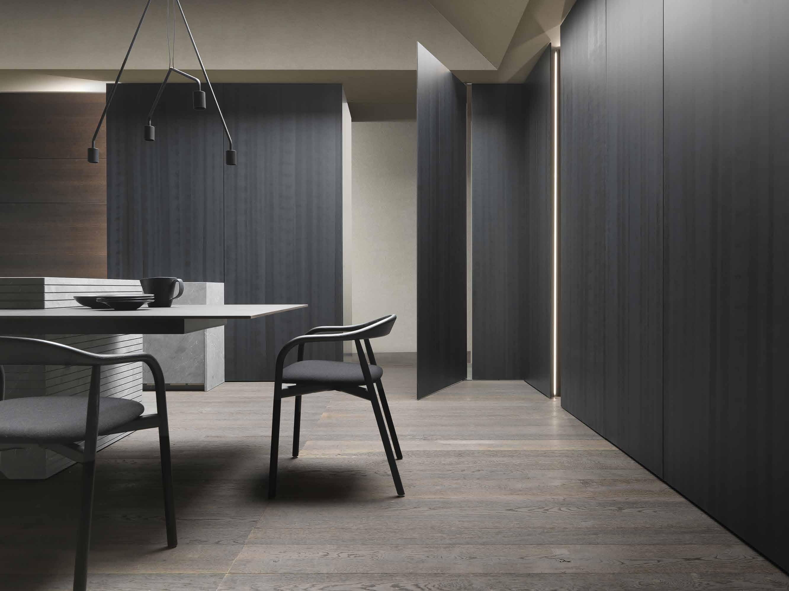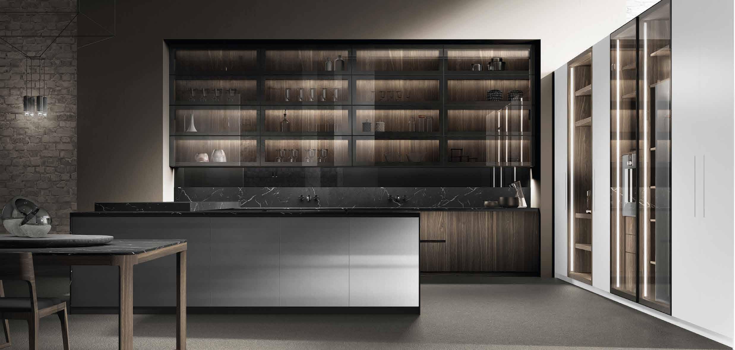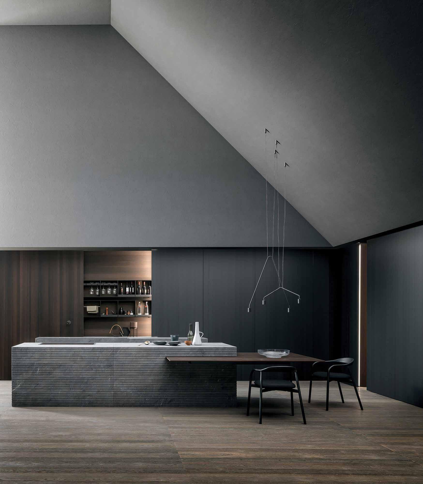popular, and I think having that open space began to resonate with people,” Shirvanian notes. “Even with pocket doors, we have technology that allows you to touch a button, and paneling comes to cover the kitchen space, so when you look at it, it doesn’t seem like kitchen cabinets. You see large, sleek panels.”