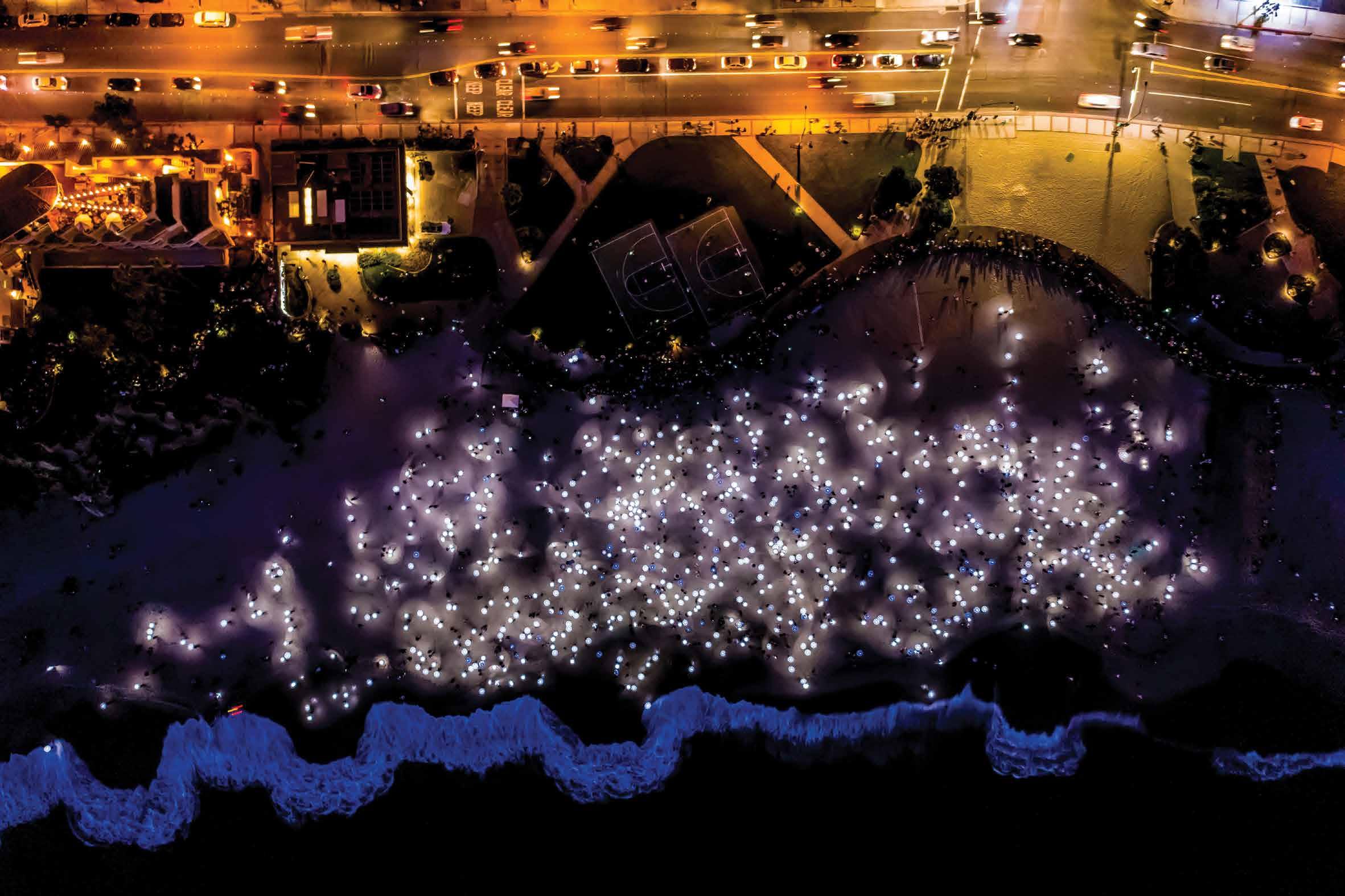 One notable participatory project Turk conducted involved gathering a retirement community together shortly after the COVID-19 restrictions were lifted. People gathered in a courtyard holding decorative umbrellas over their heads as a drone flew by, capturing images that would later be pieced together into a kaleidoscopic image.