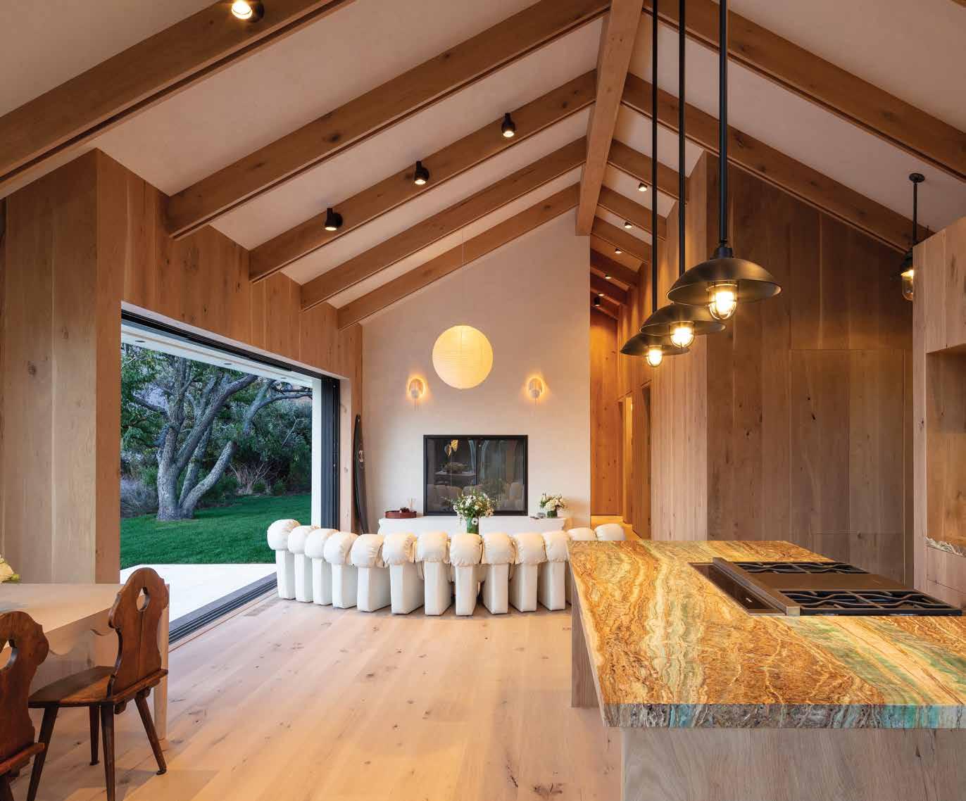 With a nod toward Mid-Century Modernism, the home’s design takes full advantage of its unique setting. Pocketing doors slide open to allow full immersion with the outdoors, creating a pavilion-like ambience where the indoor/outdoor spaces meld into one another.