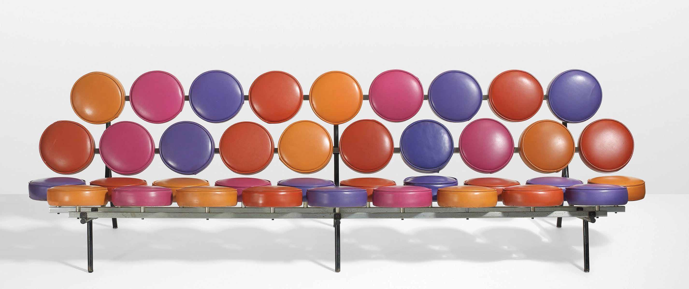 The Marshmallow Sofa is a composition of 18 12-inch foam discs mounted on a steel frame to create the illusion of being suspended in the air. With colorful, marshmallow-shaped cushions smoothly coated in vibrant vinyl fabric, the sofa defied the design norms of its time, straying from traditional upholstery. Its whimsical arrangement of multiple geometrical cushions curated into one product eventually paved the way for the pop art designs of the 1960s.
