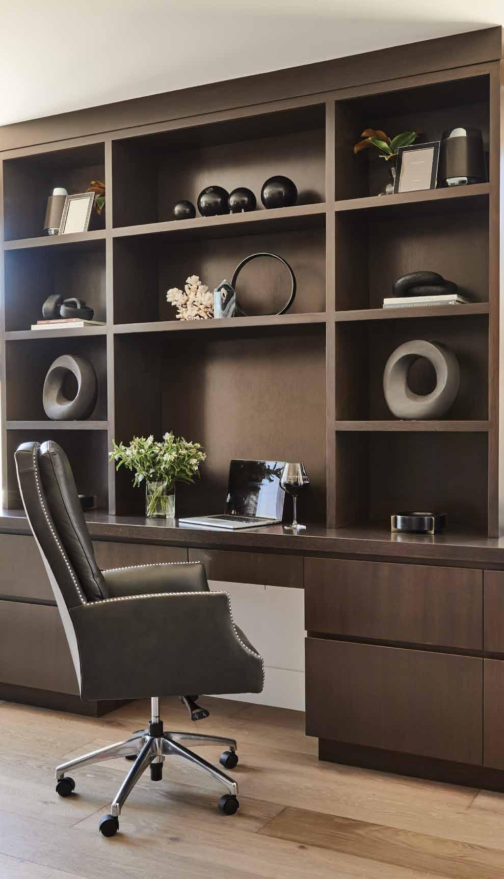 Drewett rose to the challenge by creating a 4,000-squarefoot plan that presents a blank face to the street, with an elevation taken up by a large—but architecturally handsome—garage, with the entry shifted to the side of the house. The builder and architect were able to put in a second story for the primary suite and office by excavating down a few feet to meet the community’s height restrictions. The home also includes the living, dining and kitchen on the first floor, along with two bedrooms and a den.