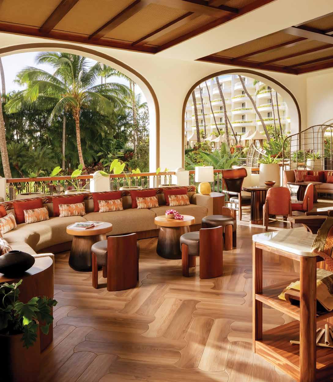 The large open lobby featured stunning fluid circular arches and mesh waterfalls in the center under a massive monkey pod wood atrium. The designer utilized a neutral palette, so the natural greenery of the plants and scenery acted as the accent color. The lobby emanates tranquil energy and a clean, refreshing aesthetic, seamlessly incorporating the materials of the landscape into the beautiful design of the hotel.
