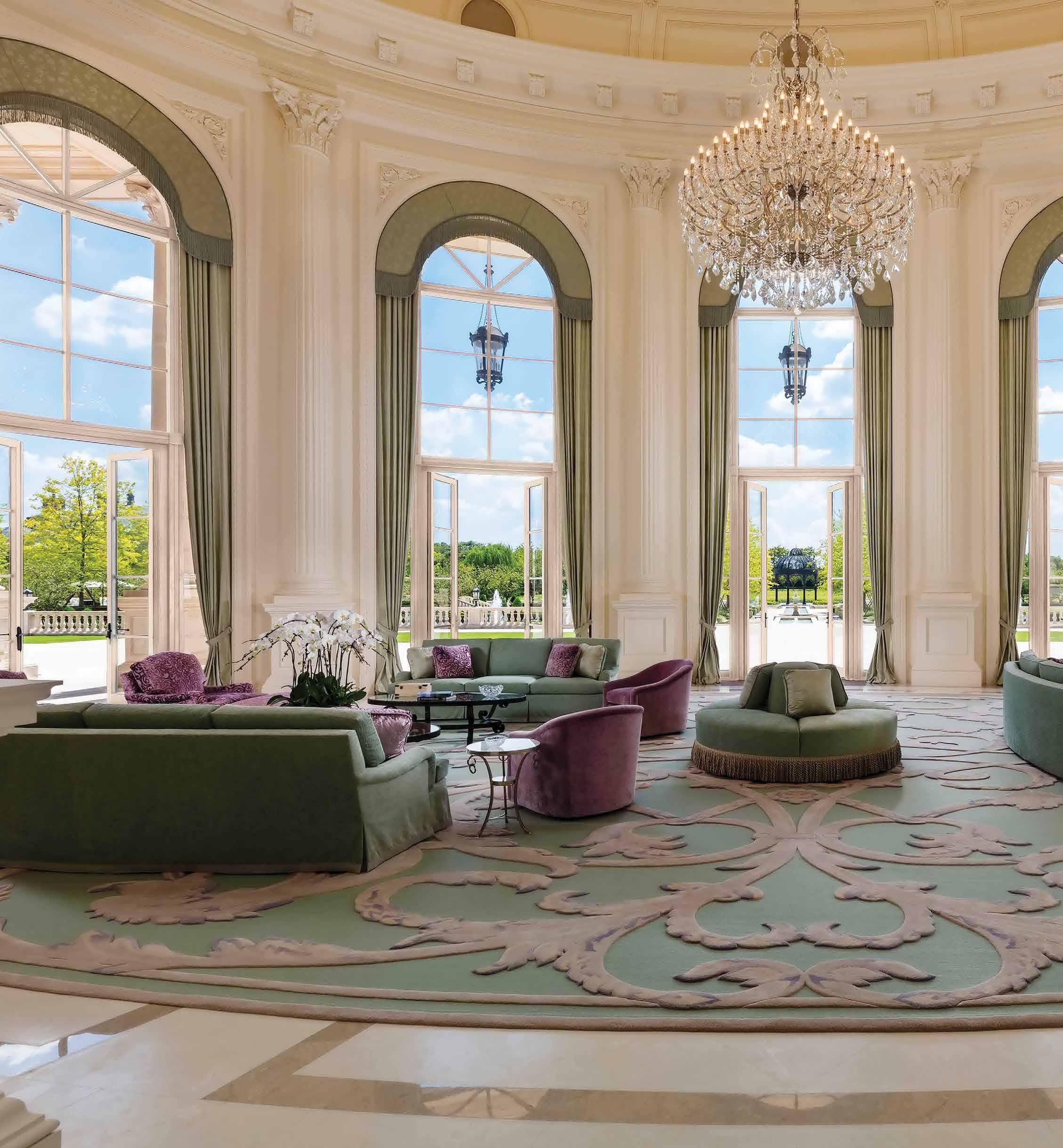 This impressive space is filled with Gallic-style jade and mauve furniture, adding a contemporary flair. A circle sectional with a bullion fringe sits at its center under a colossal, opulent crystal chandelier. Grounding the space