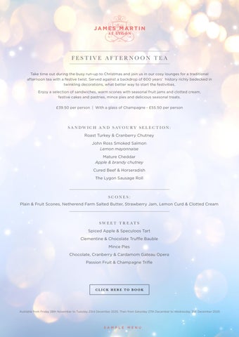 Enjoy a selection of sandwiches, warm scones with seasonal fruit jams and clotted cream, festive cakes and pastries, mince pies and delicious seasonal treats.