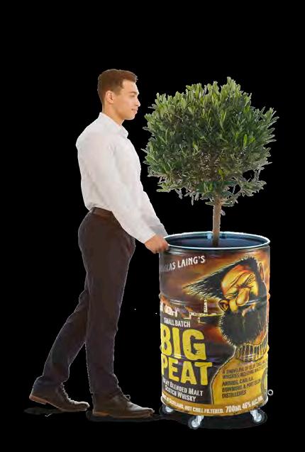 To turn a steel drum into a botanical barrel, we add a shallow tub that hangs in the barrel. This way, the barrel is not too heavy and it can be moved around easily. These replacement plant pots are a wonderful solution and offer the opportunity to personalise your space or showcase your brand in a place that is usually omitted.