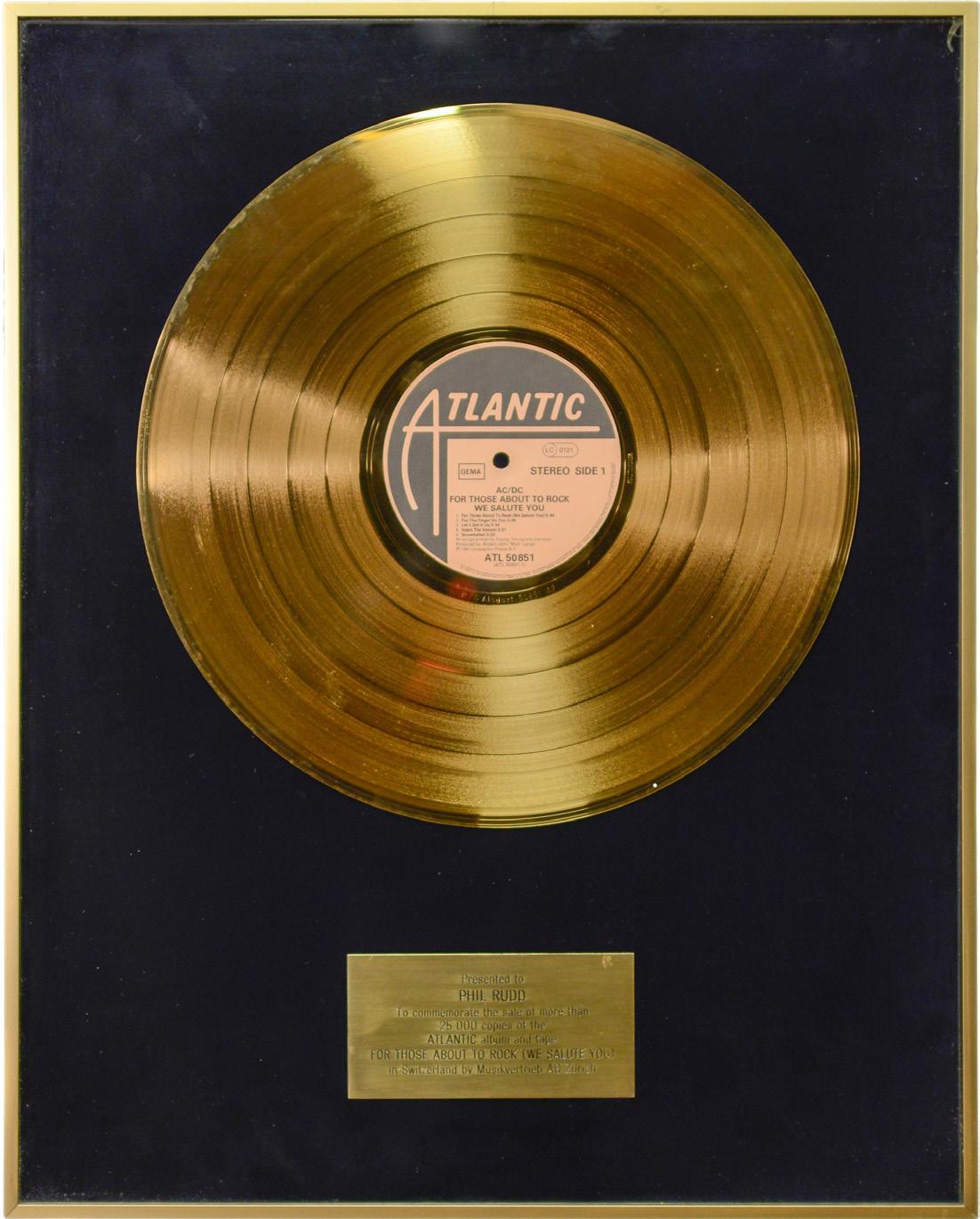 LOT #97: AC/DC - Phil Rudd’s “For Those About to Rock” Gold Sales Award