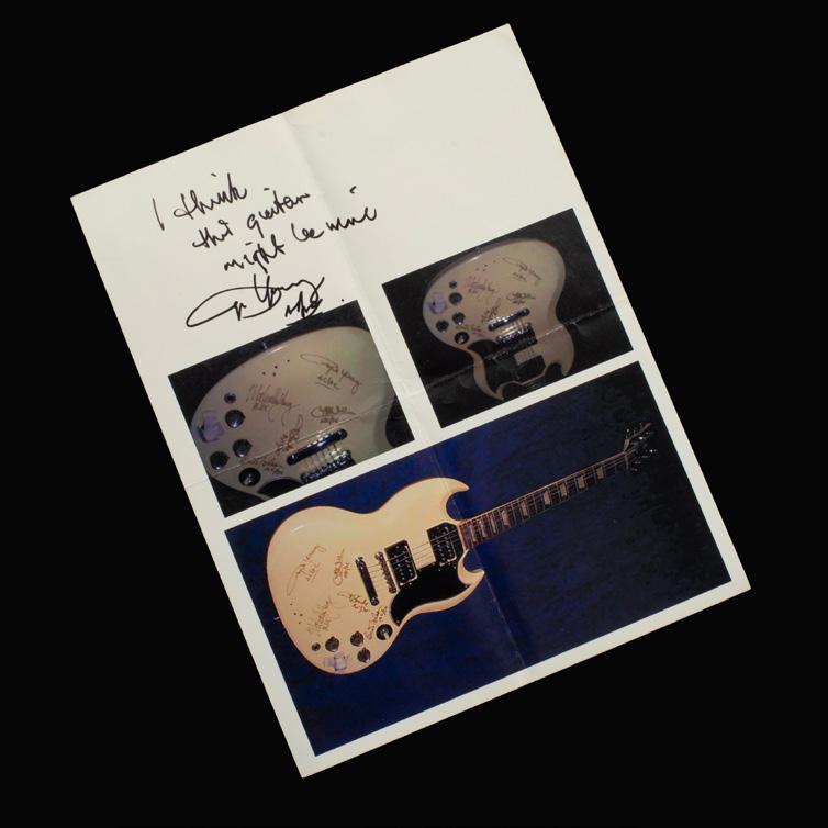 What makes this guitar uniquely intriguing is its accompanying 8” x 10” collage. This collage features three photographs of this exact guitar and a handwritten note by Angus Young that reads, “I think that guitar might be mine,” followed by his signature. The note adds an extra layer of personality and authenticity, directly tying the instrument to one of the most celebrated guitarists in rock history.
