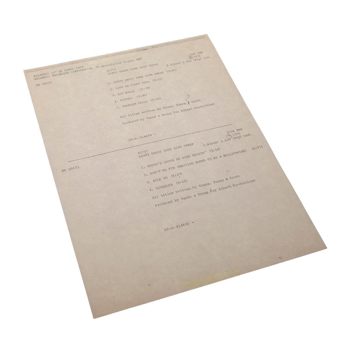 LOT #44: AC/DC - “Dirty Deeds Done Dirt Cheap” Label Copy Test Pressing