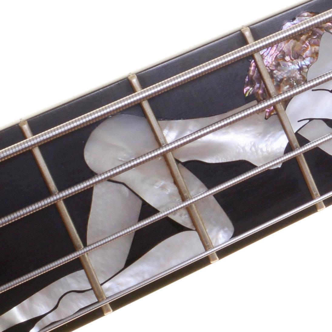 The bass features a sleek black finish, complemented by a maple neck and rosewood fretboard. A standout feature is the intricate inlay on the fretboard—a detailed depiction of a pinup-style figure crafted from mother-of-pearl and abalone, adding a touch of elegance and individuality. The headstock is emblazoned with “Steve Morrell Custom 002,” identifying it as a bespoke build. The reverse side of the headstock is inscribed with the dedication “Custom Made for Cliff Williams,” certifying its unique purpose.