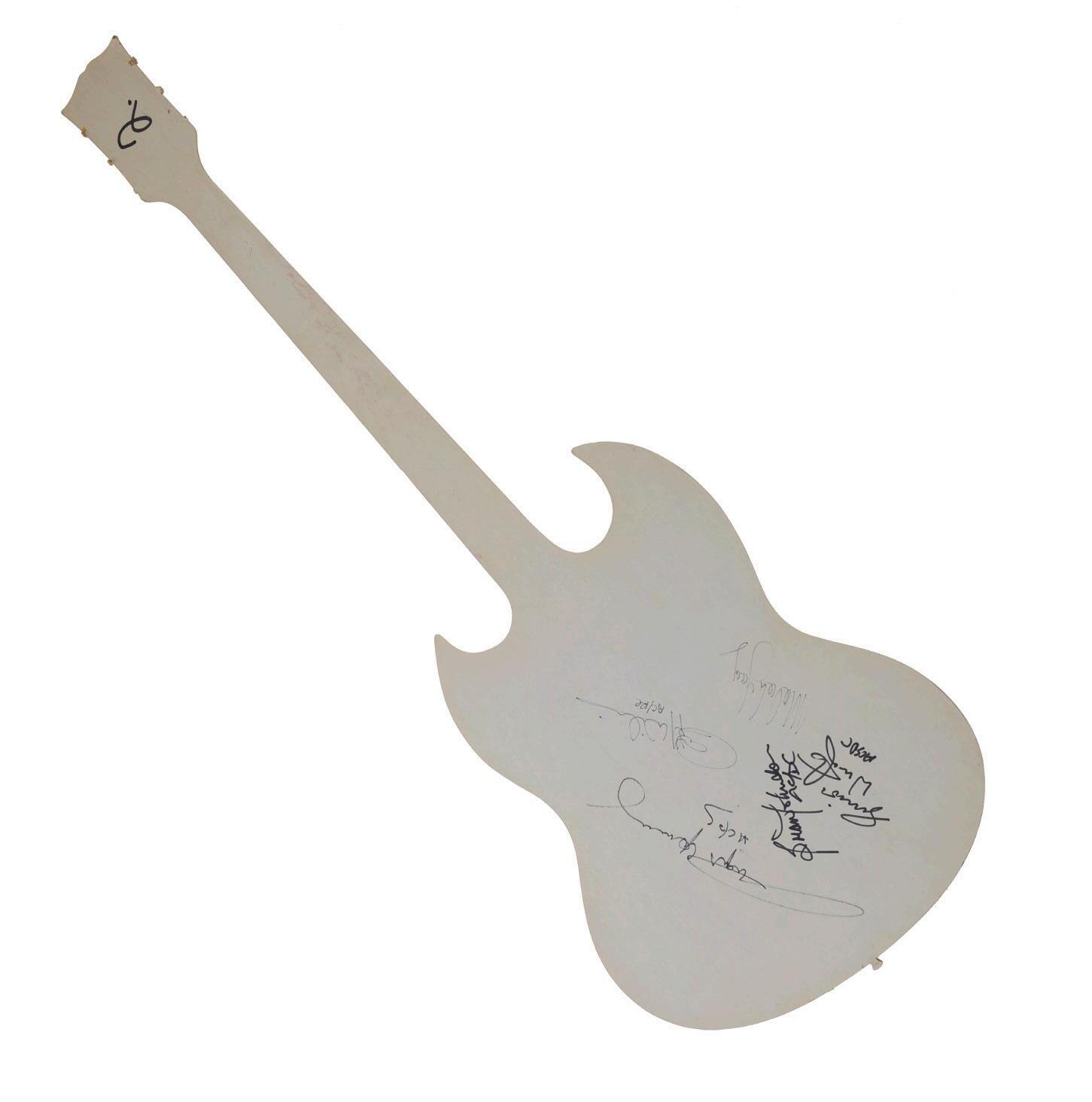 Constructed from lightweight cardboard, the guitar features a printed image of a Gibson SG, complete with a simulated Angus Young signature on the front. Adding to its uniqueness, the guitar was later signed on the back by the entire band—Angus Young, Malcolm Young, Brian Johnson, Cliff Williams, and Simon Wright—during backstage meet-and-greet sessions with the contest winners.