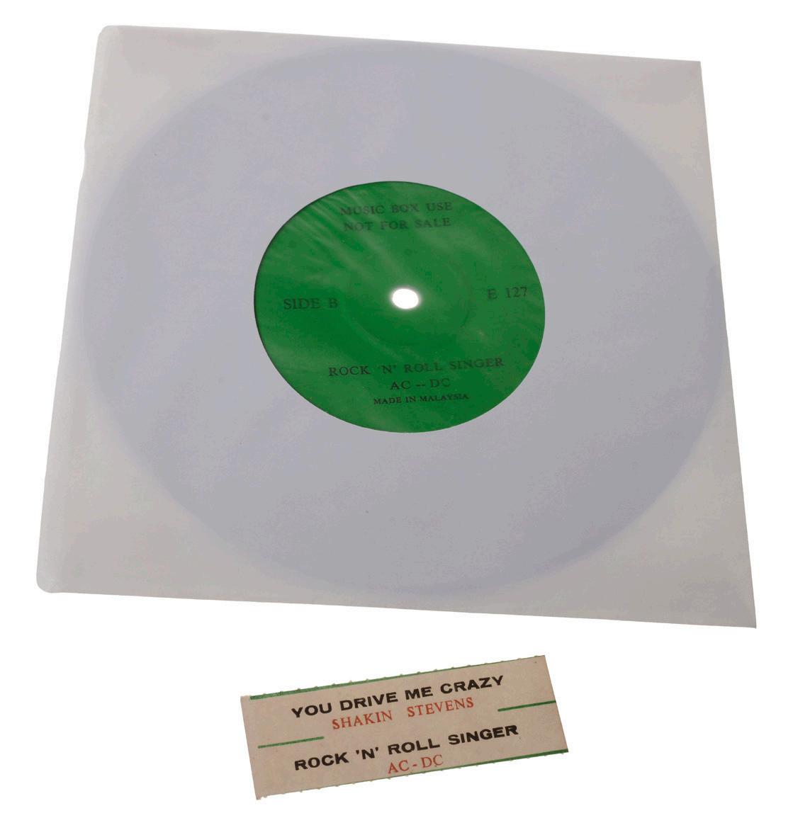 This is an extraordinarily rare 7-inch promotional single from Malaysia, labeled “Music Box Use - Not For Sale.” Pressed exclusively for jukeboxes, this release features “Rock ‘N’ Roll Singer” by AC/DC as the highly sought-after B-side. The A-side track is “You Drive Me Crazy” by Shakin’ Stevens. What makes this piece especially intriguing is its provenance—Malaysian pressings from this era are notoriously hard to find, particularly in good condition, due to their limited runs and localized use.