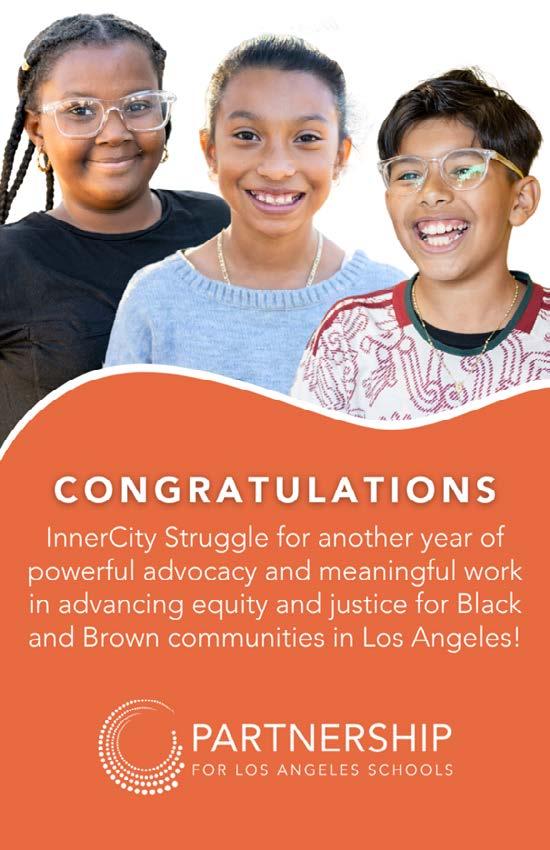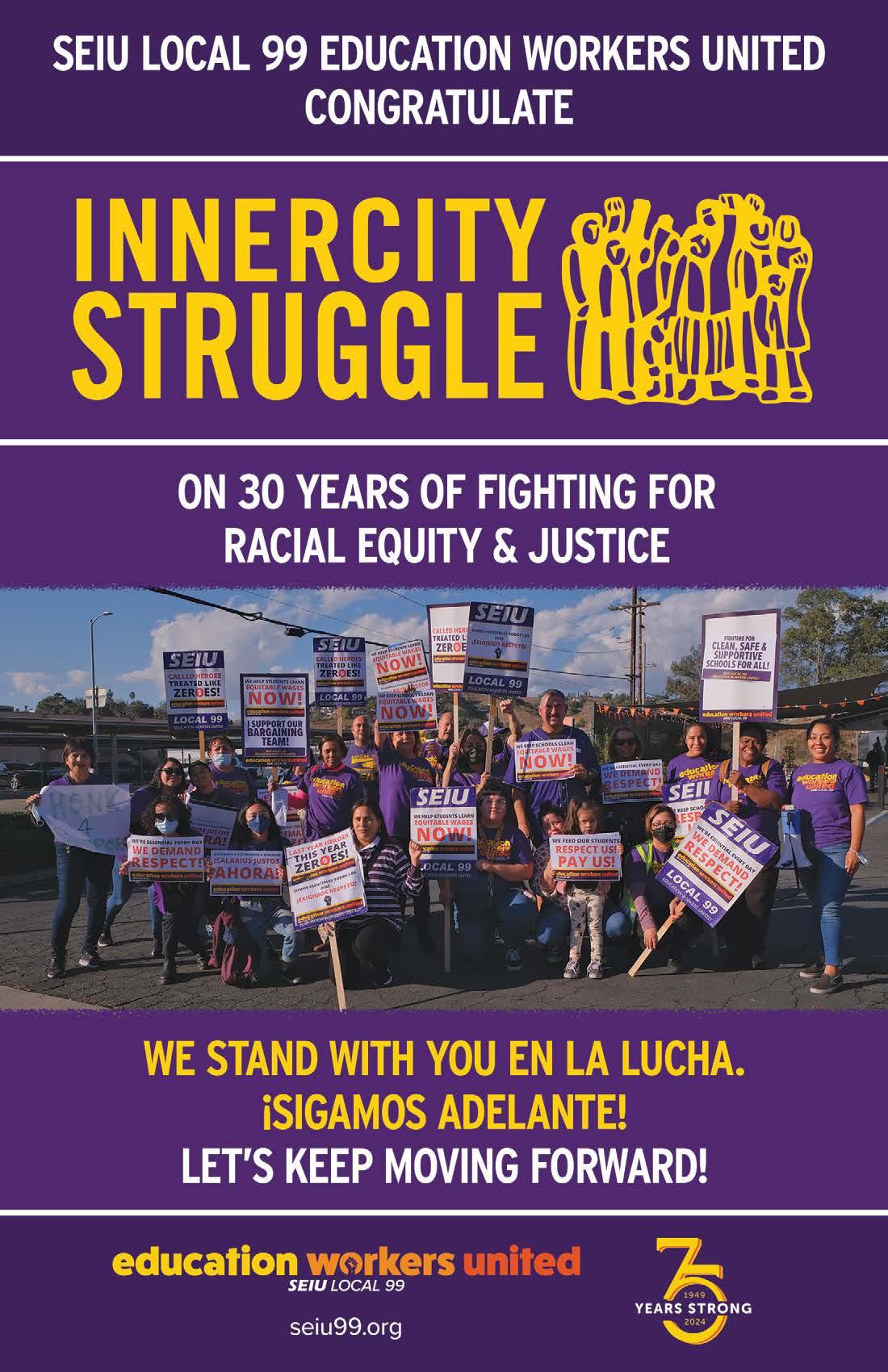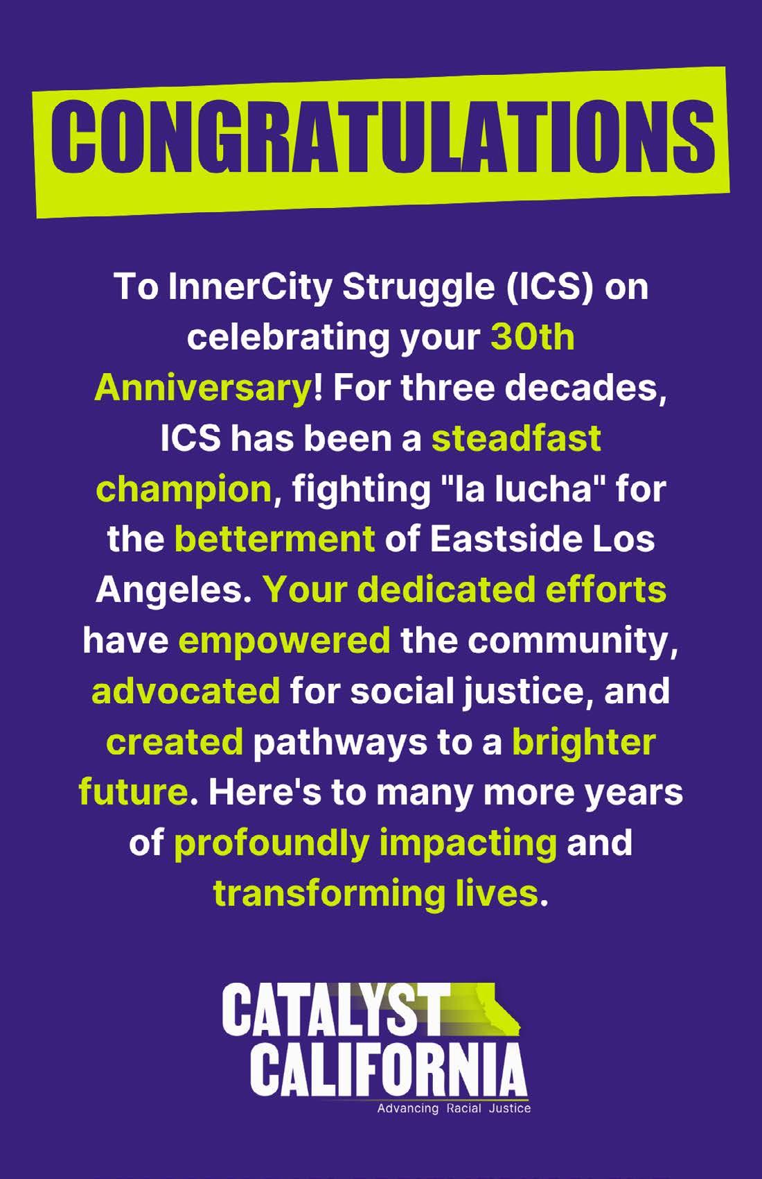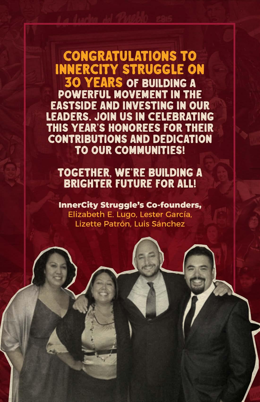 As we reflect on this 30 year journey, we also take time to honor the incredible leaders who continue to inspire us. Tonight, we are proud to recognize the work of Los Angeles City Council District 1 Councilmember Eunisses Hernandez and the Kalli Arte Boyle Heights Family Artists Collective. We also honor our United Students youth leaders - past and present. Their leadership embodies the transformative power of community-led efforts, and their dedication to justice mirrors the mission that has guided InnerCity Struggle for the past three decades.
