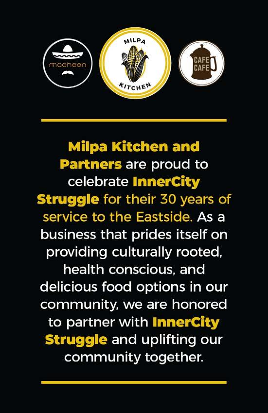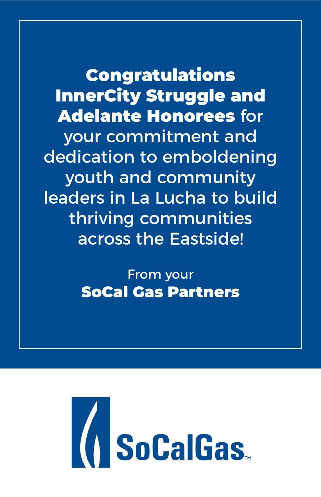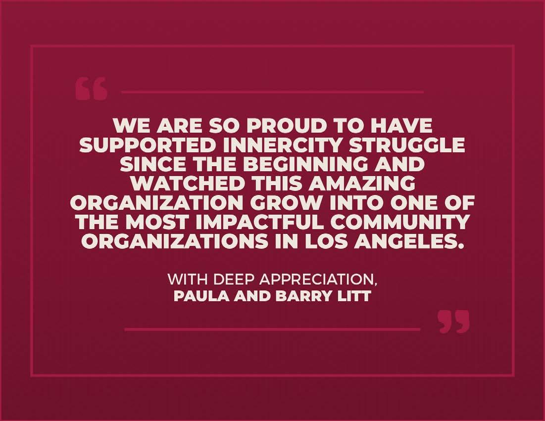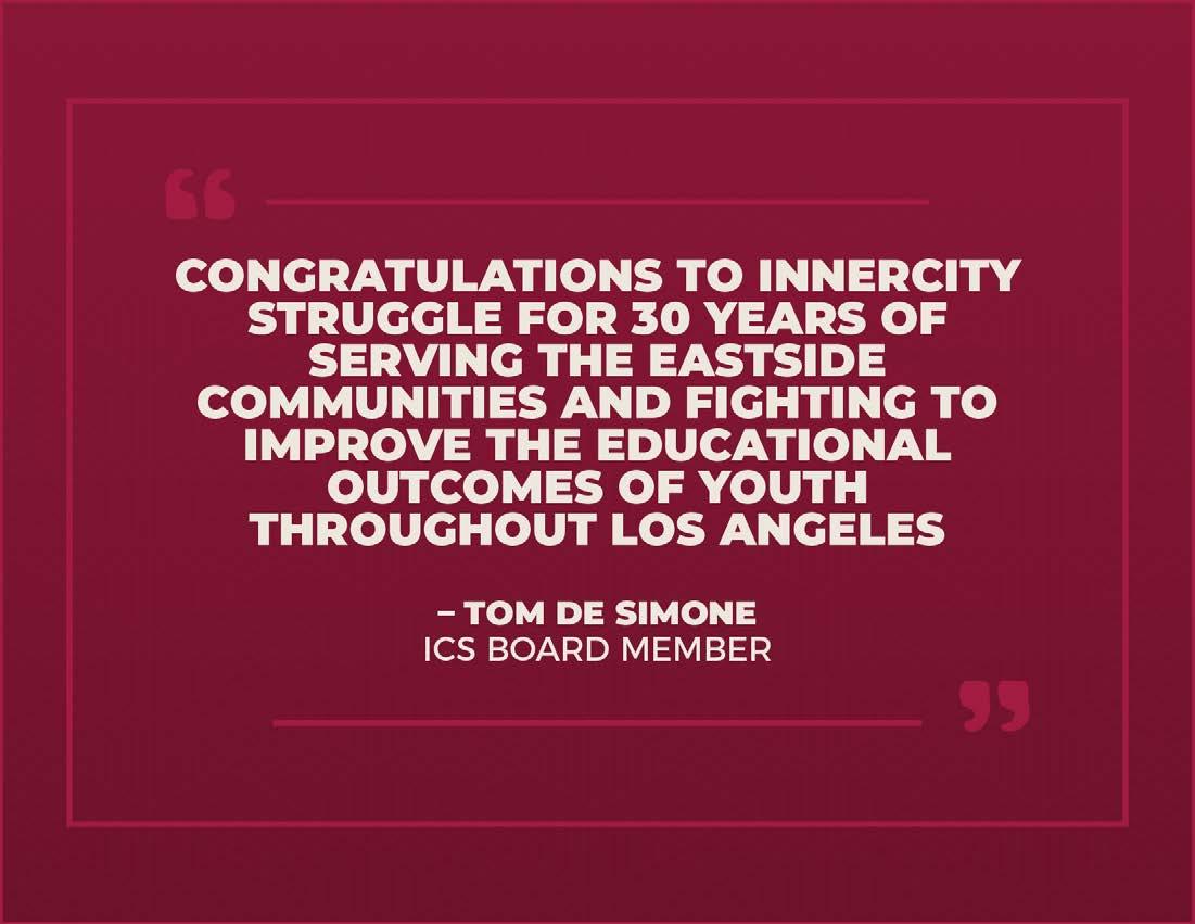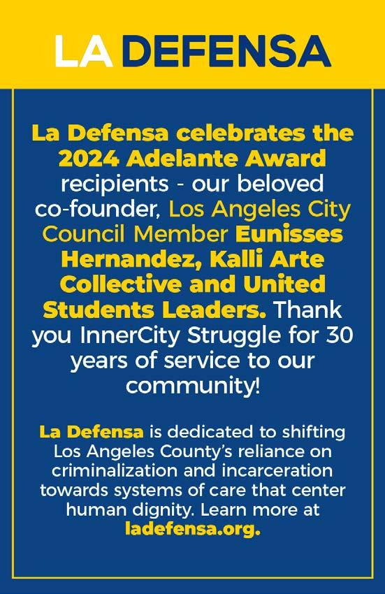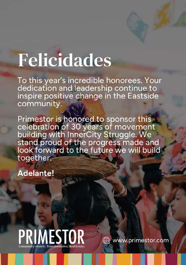 As we reflect on this 30 year journey, we also take time to honor the incredible leaders who continue to inspire us. Tonight, we are proud to recognize the work of Los Angeles City Council District 1 Councilmember Eunisses Hernandez and the Kalli Arte Boyle Heights Family Artists Collective. We also honor our United Students youth leaders - past and present. Their leadership embodies the transformative power of community-led efforts, and their dedication to justice mirrors the mission that has guided InnerCity Struggle for the past three decades.