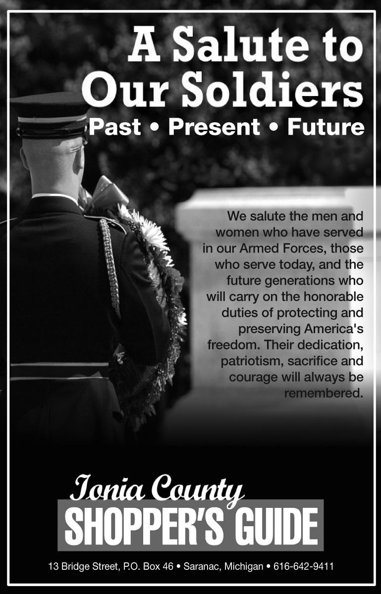 I want to show my appreciation to everyone that made the Shopper’s Guide the best advertising value in Ionia County. It would be impossible for me to list them all, so I’ll just say Thank You! And to YOU... my faithful readers... there is hardly a day that goes by that someone doesn’t call, stop by the office, or sees me on the street to tell me how much they appreciate reading the Shopper’s Guide each weekend. I always appreciate the comments.