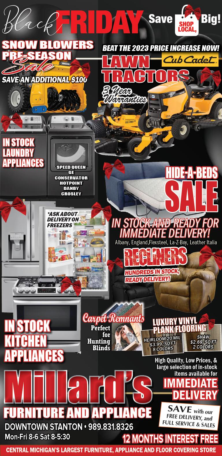 Page 18 READ THE SHOPPER’S GUIDE ONLINE AT ioniacountyshoppersguide.com - SATURDAY, NOVEMBER 19, 2022 989-637-4795 Country Side Sales 6201 Stage Rd. •Ionia MI 48846 *Financing & AvailableLayawayon some Stock! SINGLE-STAGE SNOW BLOWERS Simplicity 1022E 22"' Clearing Width Electric Start w/Recoil Back-Up 208cc Briggs & Stratton 4-Cycle OHV Engine Simplicity 1728 28” Clearing Width 420cc Briggs & Stratton 4-Cyc OHV Engine Free Hand Controls- Locks both handles, freeing one hand for chute operation Simplicity 1227E 27" Clearing Width 250cc Deluxe Two-Stage Snow Blower 110-Volt Electric Start With Recoil Backup Dual-trigger steering releases either wheel to make turning easy Simplicity1024 24" Clearing Width 208cc Deluxe Two-Stage Snow Blower 110-Volt Electric Start With Recoil Backup Dual-trigger steering releases either wheel to make turning easy Free Hand™ Control - Easily adjust through all six speeds and two reverse DUAL-STAGE SNOW BLOWERS STOP IN AND CHECK OUT OUR INVENTORY!! CASH DISCOUNTS! WE CAN HELP GET YOU PREPARED! *Subject to credit approval. Minimum monthly payments required. See store for details. SUPPORT LOCAL BUSINESS! MON - FRI 8:00 AM - 5:30 PM • SAT. 8:00 AM - 3:00 PM CLOSED SUNDAY Open Enrollment for Health Insurance is NOW! BCBSM, PHP, Priority Health, McLaren & Marketplace plans Froling Insurance Protecting People, Families and Businesses Office (616)527-4622 • Cell (616)291-0066