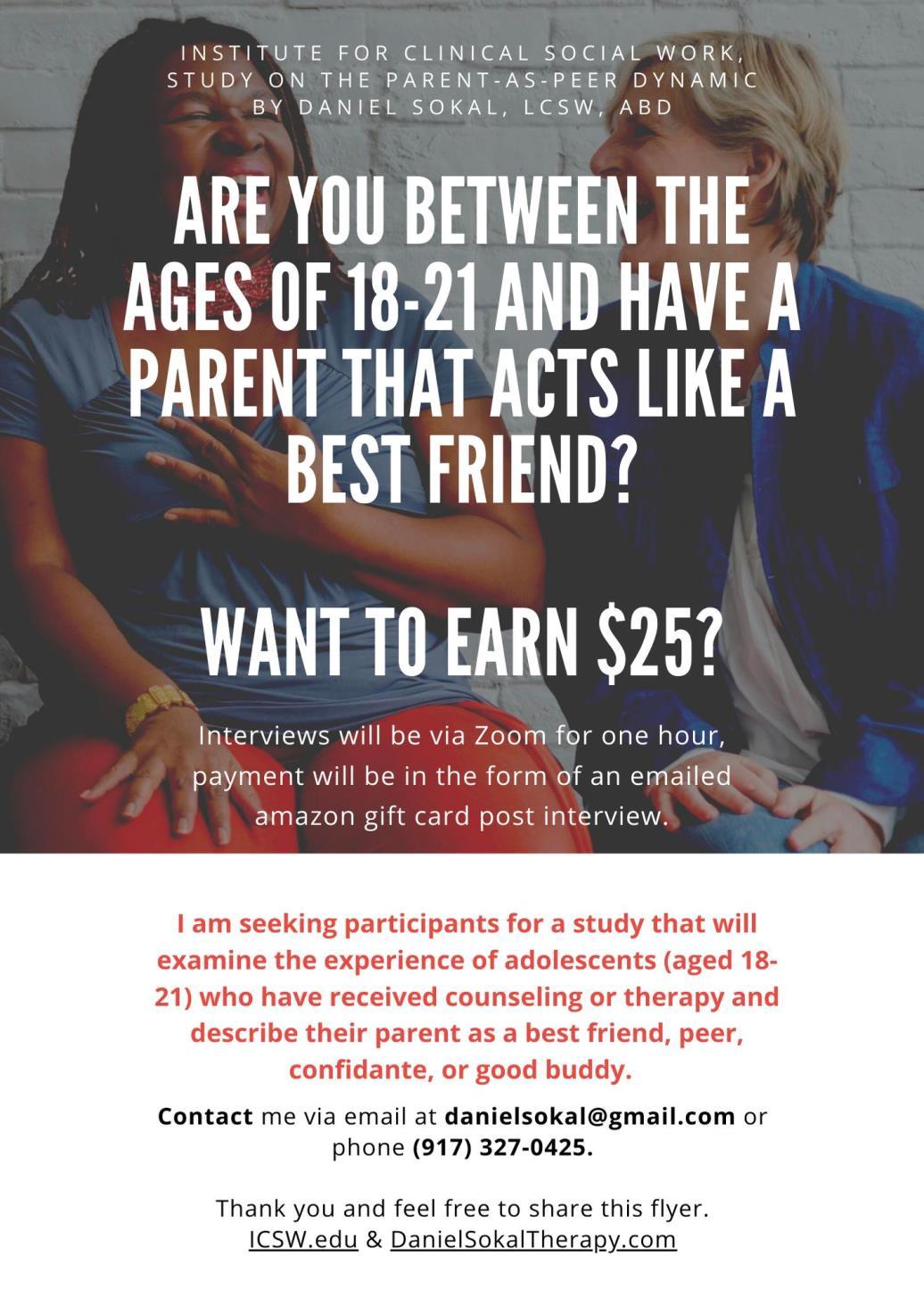 The purpose of this phenomenological study was to understand the experience of the parent-as-peer (PAP) dynamic for adolescents with psychotherapy experience.At this stage in the research, the PAP dynamic is defined as a primary symptom related to a peer-like relationship with a parent. This study examined adolescents currently in or who have completed psychotherapeutic treatment who describe their relationship with their parent as a best friend, peer, confidante, or good buddy. These types of statements often reveal a conflicted, exploitive, and inconsistent parent–child relational dynamic. The intent of this study was to gain insight into the experiences of adolescents in psychotherapeutic treatment with an identified PAP dynamic, how this dynamic relates to their relationship with their parents, and how this dynamic relates to their presenting symptomatology.