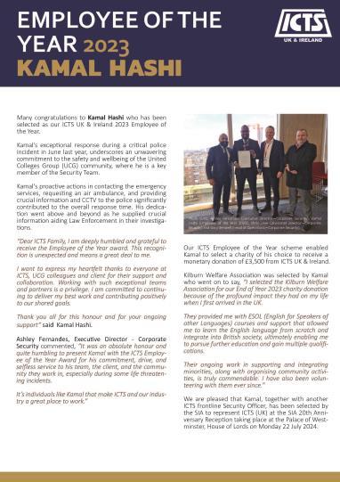As part of our Employee of the Year scheme Kamal Hashi was able to select a charity to receive a monetary donation of £3,500 from ICTS UK & Ireland.