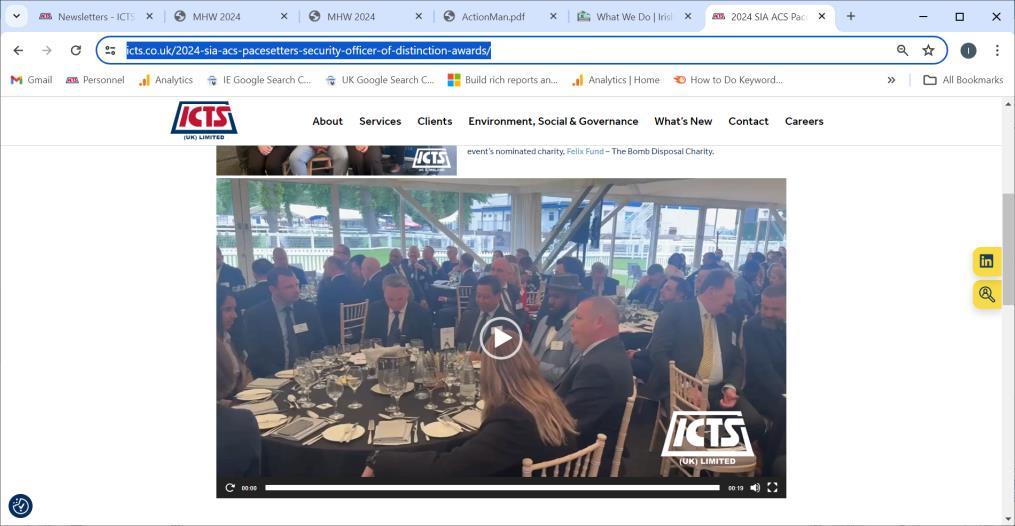 The 2024 SIA ACS (Approved Contractor Scheme) Pacesetters Security Officer of Distinction Awards took place on 22 May at Riverbank Pavilion, Royal Windsor Racecourse. ICTS was represented by colleagues from across our organisation, celebrating extraordinary acts of frontline security officers.