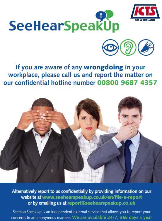 We all play an important role in preventing bribery and corruption within ICTS and if you are concerned about anything then please report it to your line manager or the Whistle-blower helpline. We are always stronger when we work together.