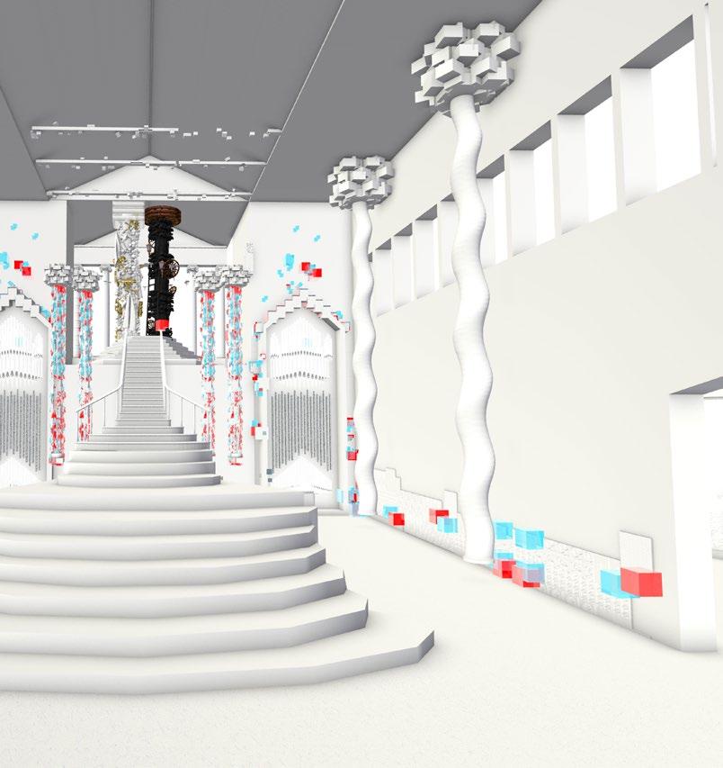 The pillars, given that the virtual space doesn’t necessitate load-bearing elements, were intentionally designed to appear more fragile and distorted. Pipe Chambers draw inspiration from the original interiors. The suspended glitch effect serves as a representation of music, symbolizing the auditory output emanating from the pipes. Experimental soundtrack created on Ableton. Click here to listen or scan QR code.