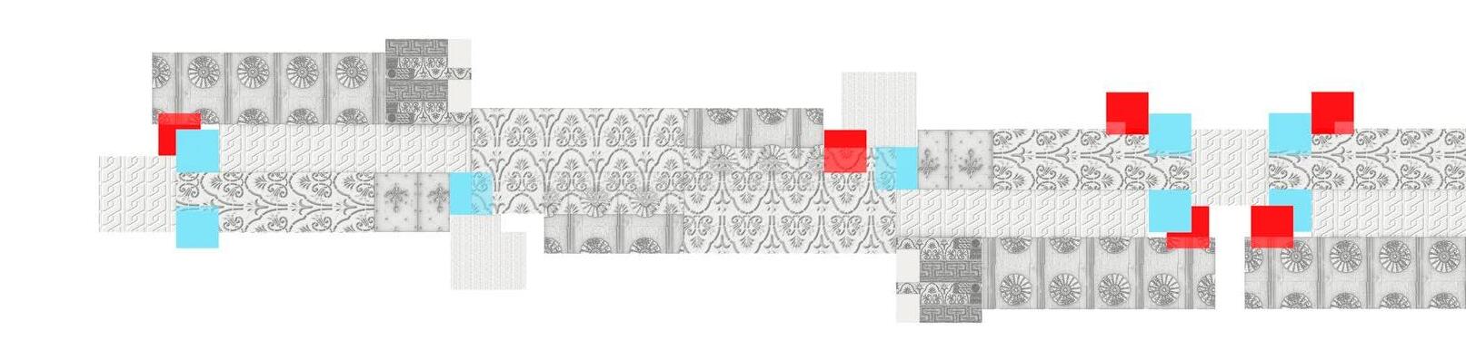 Model making of initial design stages. Inside the church, the Glitch is manifested through conglomerates of the original motifs by Alexander Thomson. These patterns are deliberately arranged in a randomized sequence, emulating a loading glitch effect. The Glitch was also extended to the entrance of the church. This portal looking entrance, was inspired by the photograph of the pulpit of the Church. I wanted to reference its symmetrical geometry while also adding a pediment, to convey a sense of ethereal and sacred.