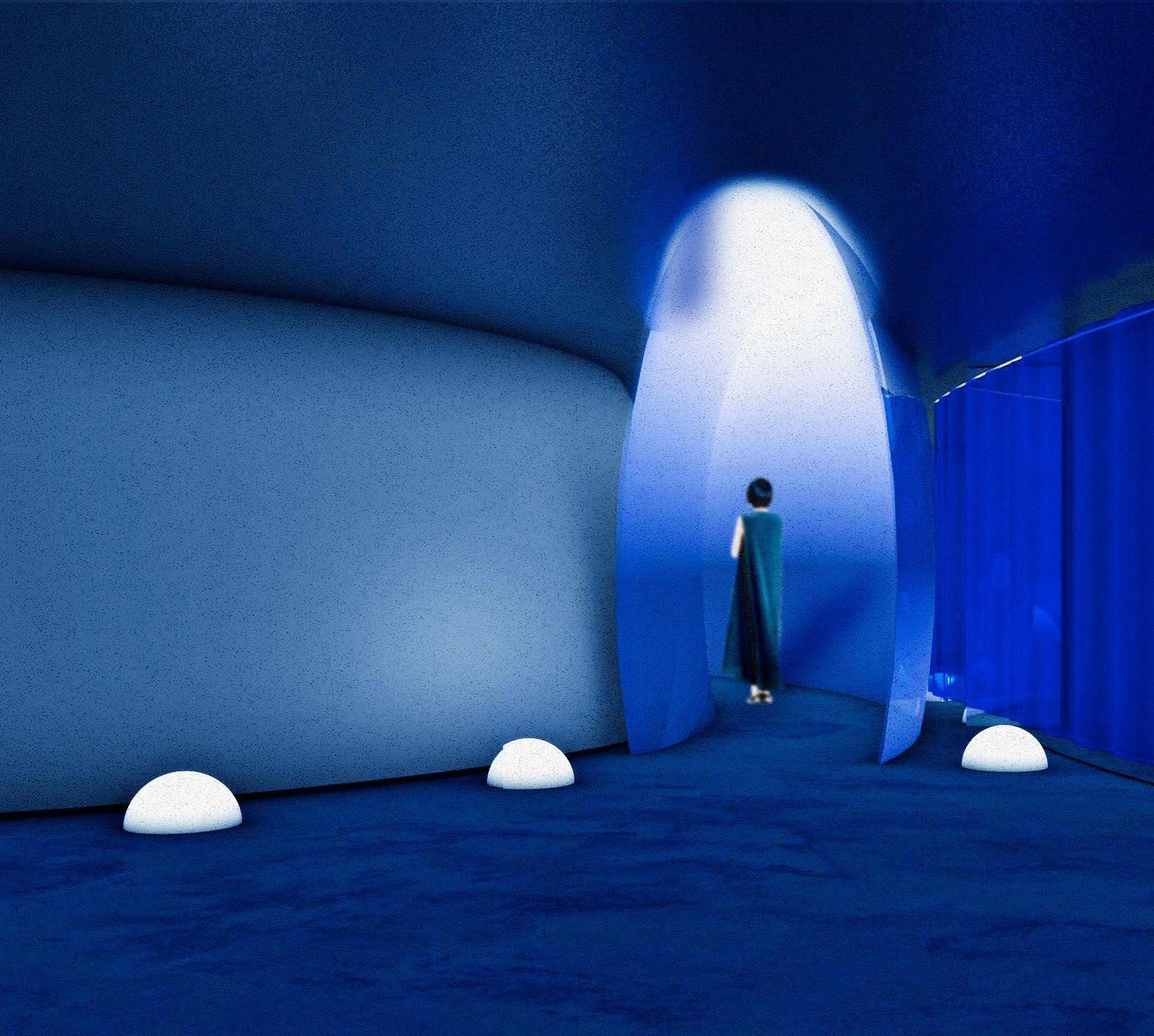 An expansive infinity pool is enclosed by a sizable hemisphere, within which captivating visuals are projected and mirrored on the water’s surface. This innovative pool design defies the spatial limitations of the car park environment. Swimmers can gaze upon an endless cosmic panorama as they navigate the depths of the pool.