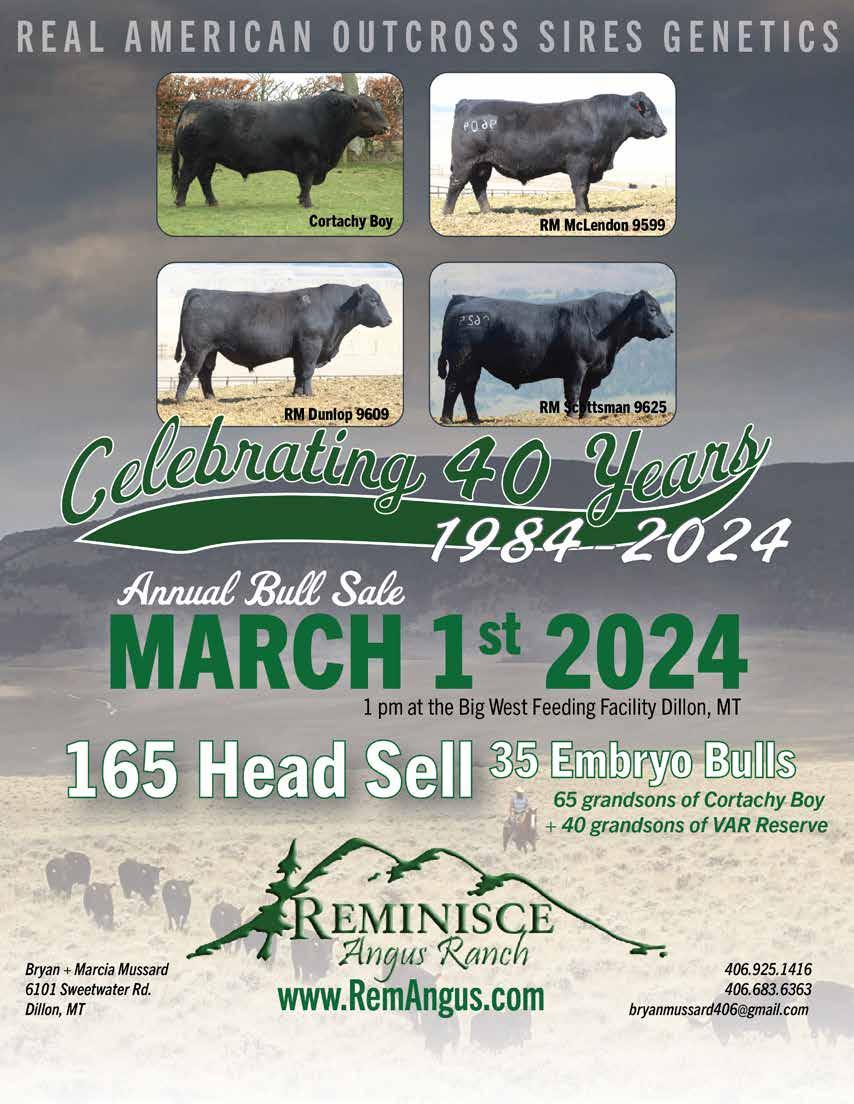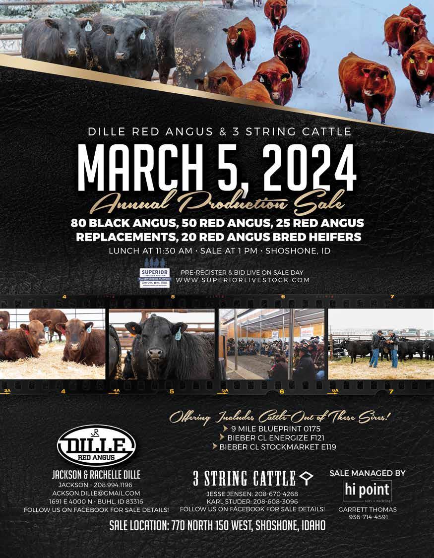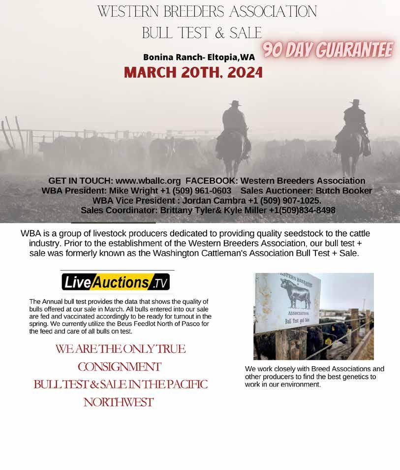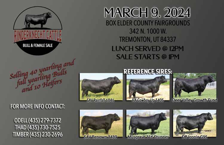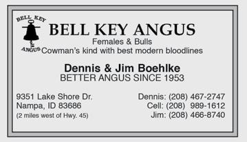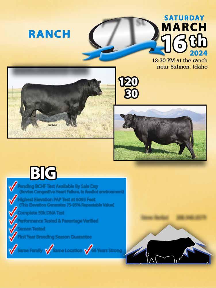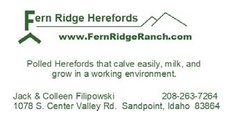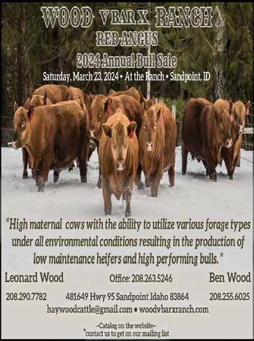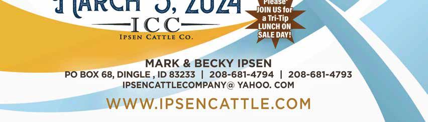 Box 612266 • 2805 East 14th Street Dallas/Ft. Worth Airport, Texas 75261-2266 Dennis Boehlke 9351 Lake Shore Drive Dennis: Nampa ID 83686 (208) 989-1612 2 miles west of Hwy. 45 PRIVATE TREATY SALES HEREFORD & RED ANGUS 2 Year Olds & Spring Yearling Bulls Spring Yearling Hereford & Red Baldy Heifers James & Dawn Anderson 208-280-1505 208-280-1509 Beverly Bryan JBB/AL HEREFORDS 1973 S 1500 E GOODING, ID 83330 jbbalherefords@gmail.com Bryan & Charly Anderson 208-280-1964 Jae Anderson Check out our offering at jbbalherefords.com DutchFlatAngus Annual Production Sale February 9, 2024 @ Lewiston Livestock Market Nick Waldher 509-751-7482 Joe Waldher 509-566-7207 257 Dutch Flat Road, Pomeroy, WA 99347 ndwaldher@q.com KNIPE LAND COMPANY “The trusted brand for over 70 years” We specialize in 1031 exchanges. Ready to buy or sell? Call today! info@knipeland.com • 208-345-3163 • www.knipeland.com Premier Ranches • Farms • Real Estate AMERICA’S LIVESTOCK MARKETING LEADERWORKING FOR YOU. 2700 Airport Way, Boise, ID, 83705 855-868-6842 info@superiorlivestock.com VISIT OUR NEW BOISE LOCATION! AMERICAN HEREFORD Association EMILEE HOLT Territory 1 Field REp. PO BOX 151, Huston, ID 83620 (208) 965-3130 cell eholt@hereford.org BUILT ON TRADITION. ENGINEERED TO SUSTAIN. BREEDER & SERVICE GUIDE