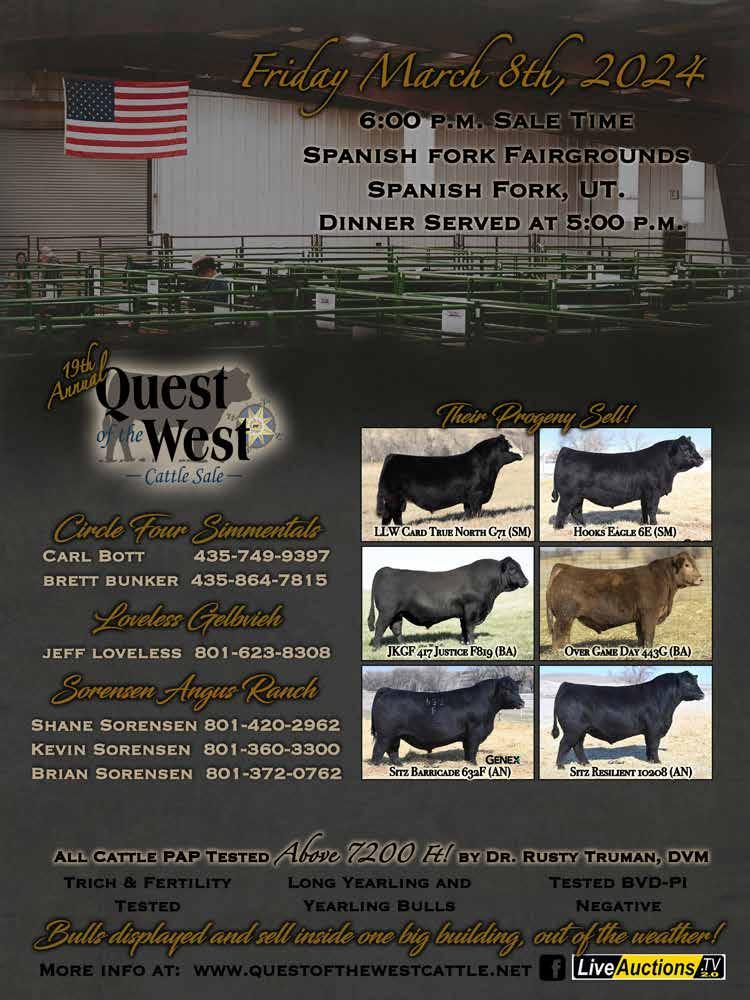 5th Annual | Thursday | 12:00 PM (MST) CACHE VALLEY BULL SALE MARCH 7, 2024 SALE MANAGER: Matt Macfarlane (916) 803-3113 (cell) m3cattlemarketing@gmail.com m3mcattlemarketing.com John Cannon 818-400-4515 2214 East 800 South Preston, ID 83263 cannonangus.com ONLINE BIDDING AUCTIONEER Jake Parnell 916-662-1238 Contact Matt Macfarlane or John Cannon for bull details, including yearling ultrasound, performance and fertility data, as well as Zoetis HD50K genomic testing results and genomic enhanced EPDs. SELLING AN ELITE SET OF 50 WINTER YEARLINGS AND 5 TWO-YEAR-OLD ANGUS BULLS FROM PROVEN SIRES AND AN OUTSTANDING COWHERD! TEHAMA PATRIARCH F028 AAA *18981191 CED BW WW YW MK MRB RE $B $C +14 -1.8 +66 +130 +30 +.85 +.79 +157 +283 WOODHILL COMSTOCK AAA +*19674083 CED BW WW YW MK MRB RE $B $C +16 -2.6 +64 +113 +44 +1.38 +.98 +171 +322 TEHAMA TAHOE B767 AAA #+*17817177 CED BW WW YW MK MRB RE $B $C +9 +.1 +79 +135 +28 +.91 +.75 +155 +274 CASINO BOMBER N33 AAA *18658677 CED BW WW YW MK MRB RE $B $C +12 -1.5 +79 +130 +26 +.84 +.90 +177 +298 WOODHILL PATENT AAA *19199070 CED BW WW YW MK MRB RE $B $C +10 -1.4 +77 +144 +32 +.83 +.55 +162 +262 MUSGRAVE 316 EXCLUSIVE AAA *18130471 CED BW WW YW MK MRB RE $B $C +8 +.9 +65 +118 +29 +.89 +.59 +168 +298