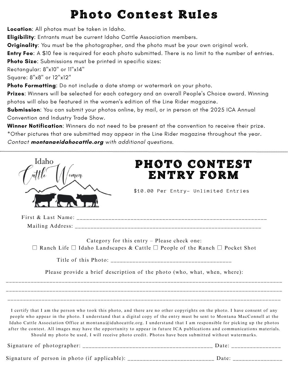 Please return your payment and registration form to the ICA office by Monday, October 13. Forms can be emailed to michelle@idahocattle.org or mailed to Idaho Cattle Association, PO Box 15397, Boise, ID 83715. Meal availability cannot be guaranteed after the
