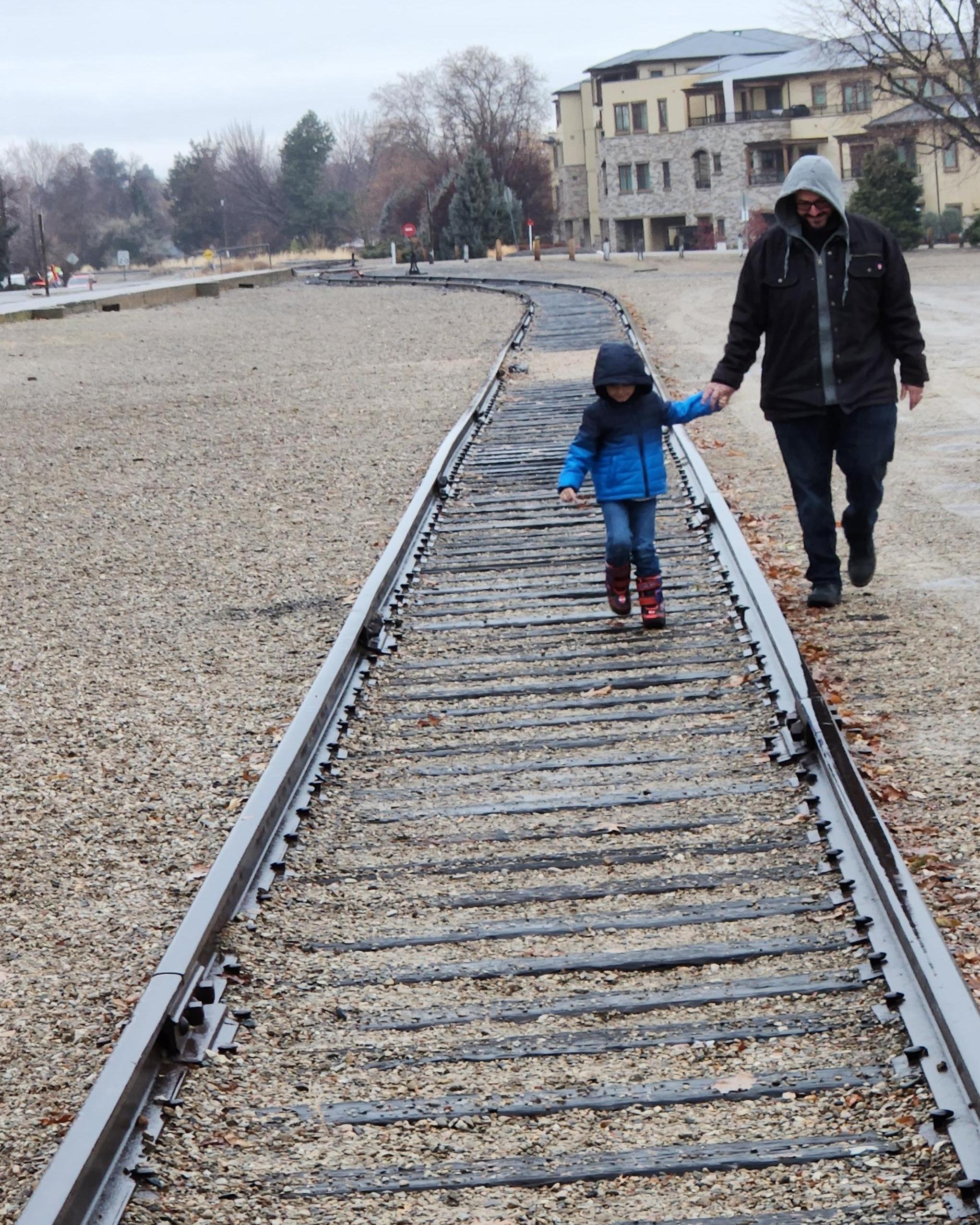 Jeremy Felkel and his son Elijah walk along the tracks at Boise Train Depot on December 11, 2022