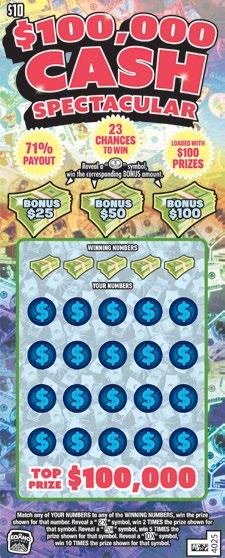 bonus piles of cash where players can win $25, $50, or $100 instantly. This game pays out 71%, players can multiply their wins by two, five, or ten times, and they can win on all 23 spots. With all that excitement bundled into a single ticket, players can smell the cash just walking in the door!
