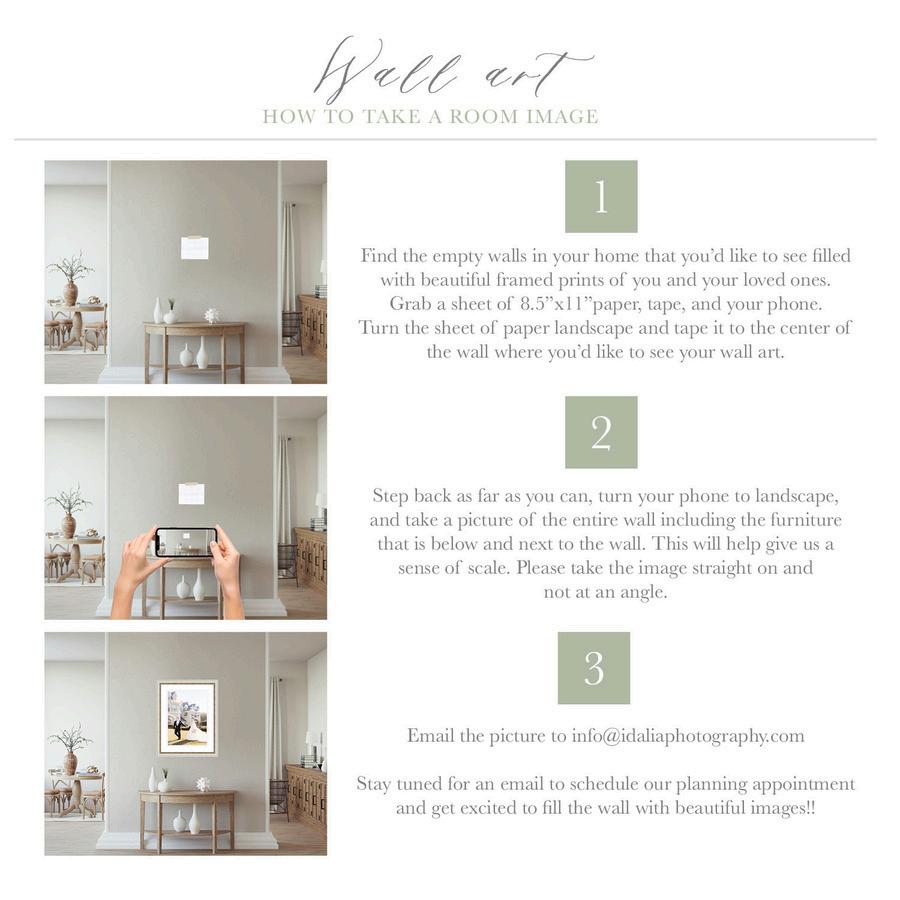 Grab a sheet of 8.5"x11" paper, tape, and your phone. Find the empty walls in your home that you’d like to see filled with beautiful framed prints of you and your loved ones. Turn the sheet of paper horizontally and tape it to the center of the wall where you’d like to see your wall art