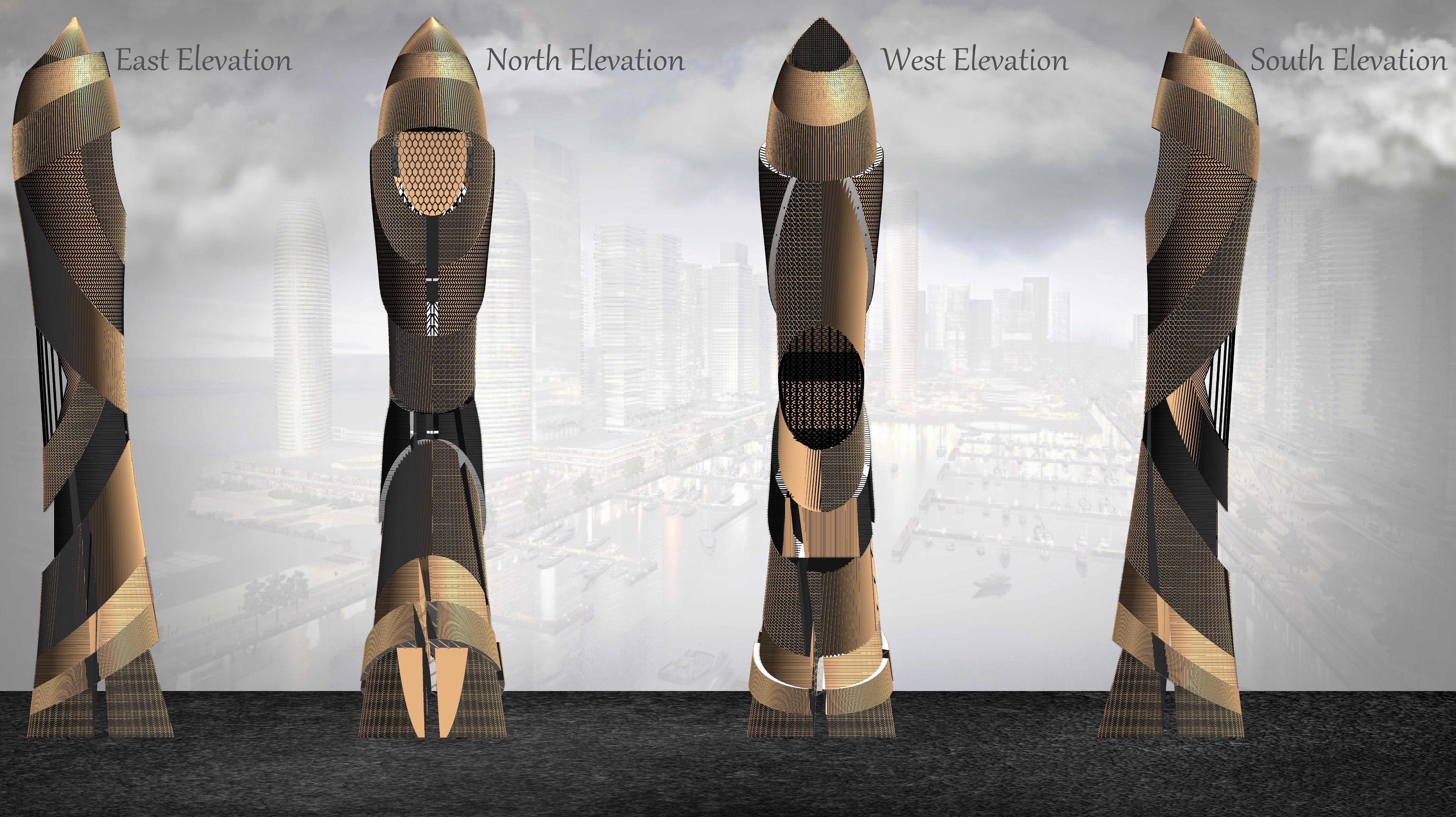 Black and gold were major influences to how the exterior and interior colors come together, as well as how I drew the floor plans. The composite drawing on the bottom shows the floor architypes in scale with each other. There were floors only for the lobby space, commercial use, office use, residential use, educational use and museum usage (ascending in that order). All of which had there own floor plan design to give them each their own personality. The Commercial and Lobby floor architypes are divided into four parts for the bottom of the portion of the edifice is split into four parts to allow air to pass through and reduce the amount of draft caused by the structure on the ground level of the city. Additionally, this alllows the four parts to combine into one building, but with a slight twist. Adding a twist to these four parts allows for more light to penetrate the massive interior space, and adds lateral stability to the project.