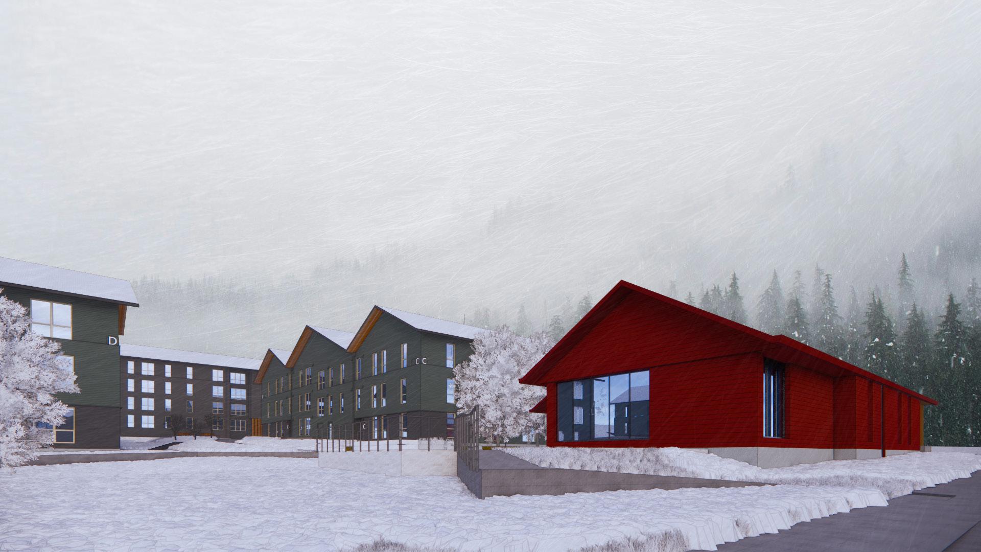 For the bottom three renders, they show the work I made on the interior of the buildings. Our workflow was main design changes were made in SketchUp before we brought it into Revit to coordinate with consultants on next steps for the pragmatics of the actual architecture. I worked in both SketchUp and Revit to design and document the changes in the building design. For example, in the community building kitchen (bottom left), I designed the vaulted interior ceiling in SketchUp then went to Revit to place the lights in accordance to how the luminaire engineer suggested. There was a back and forth on what type of lights we should use, how far we should place them to create a rythm with the 9-wood trusses, and trying to reduce the amount of lights to save on cost once we figured out we were over budget. I continued this hrough casework, air terminals, wall paints, equipments, etc.