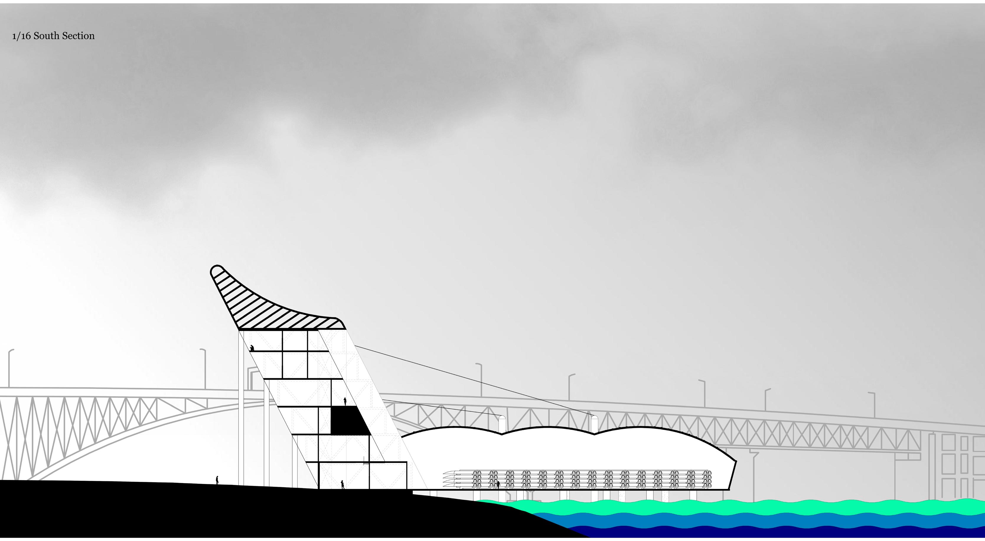 For the design, I eventually came up was combination of a light house and a boat. In the section to the top right, the taller portion of the architecture is meant to retain all programmatic elements except for holding the actual boats, while the longer part over the water is suppose to hold the boats. My reasoning for dedicating a large potion of the project over the water is to allow the boats to easily access the water from the building trough a ramp system. Contunuilly, I made the decision to add a lattice structure to the top of the tall portion to simulate the form of fins or sails, and the idea of using a lattice frame became common theme throughout the rest of the design. This is epecially apparent in the roof of the portion over the water, which is exclusively used for holding the boats.