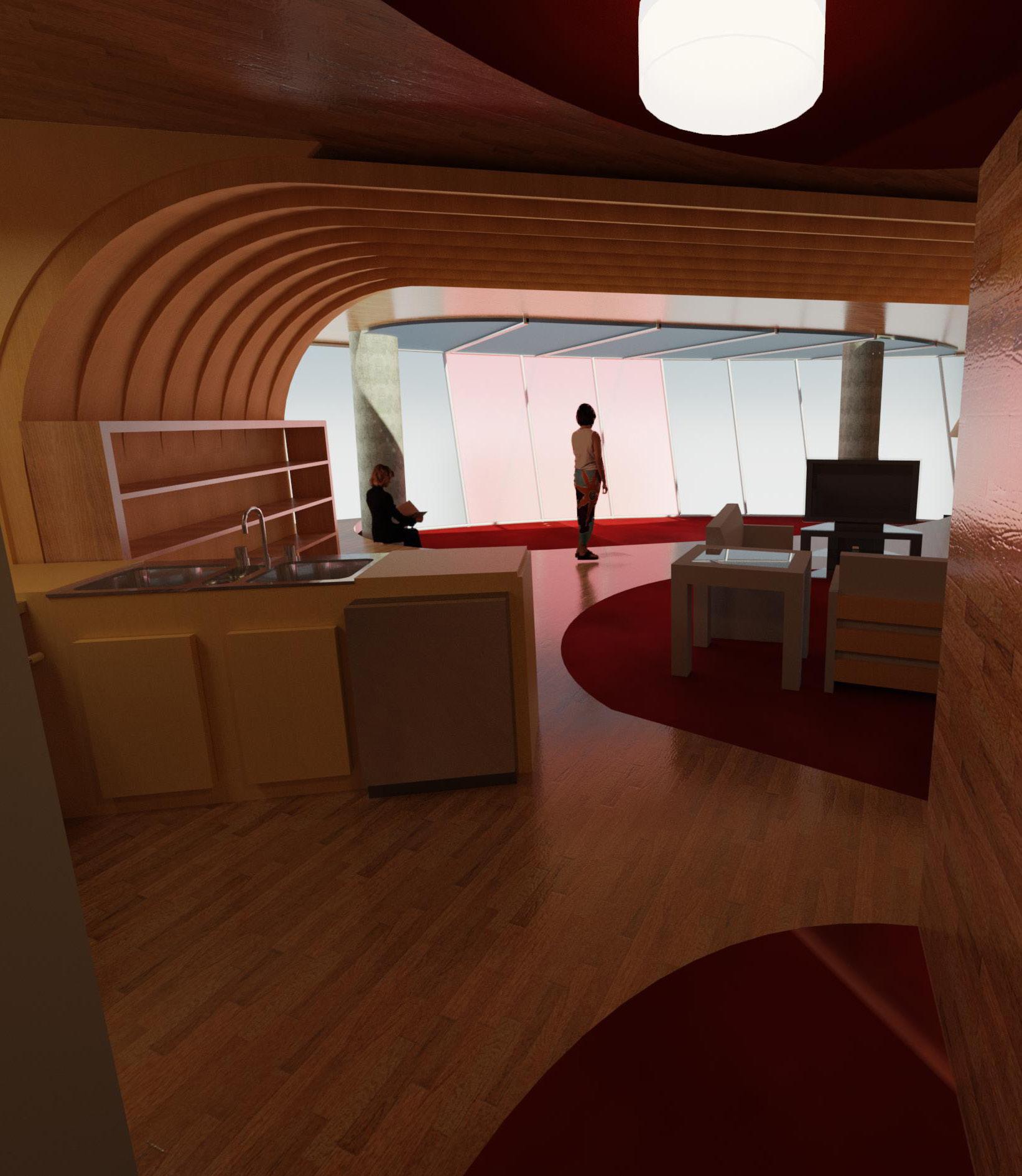 The skyscraper is 450 feet tall, with a floor every 10 feet. Conversely, the first 4 floors were all used for the lobby. The goal of the floor plans was to add fluidity to them, as well as in the perspective to the left of the tower from outside. The rest of the interior design was meant to retain the continuity of the fluidity caught from the exterior, and then further transfer the flow of the render into the way the floor plans flow as well. All of which stride to hold a organic shape similar to a rose.