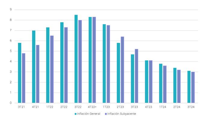 A pesar de que la inflación general ya tocó un “pico”, la inflación subyacente sigue mostrando persistencia (por arriba del 8%), por lo que el incremento en tasas continuará y la actividad económica se ralentizará.